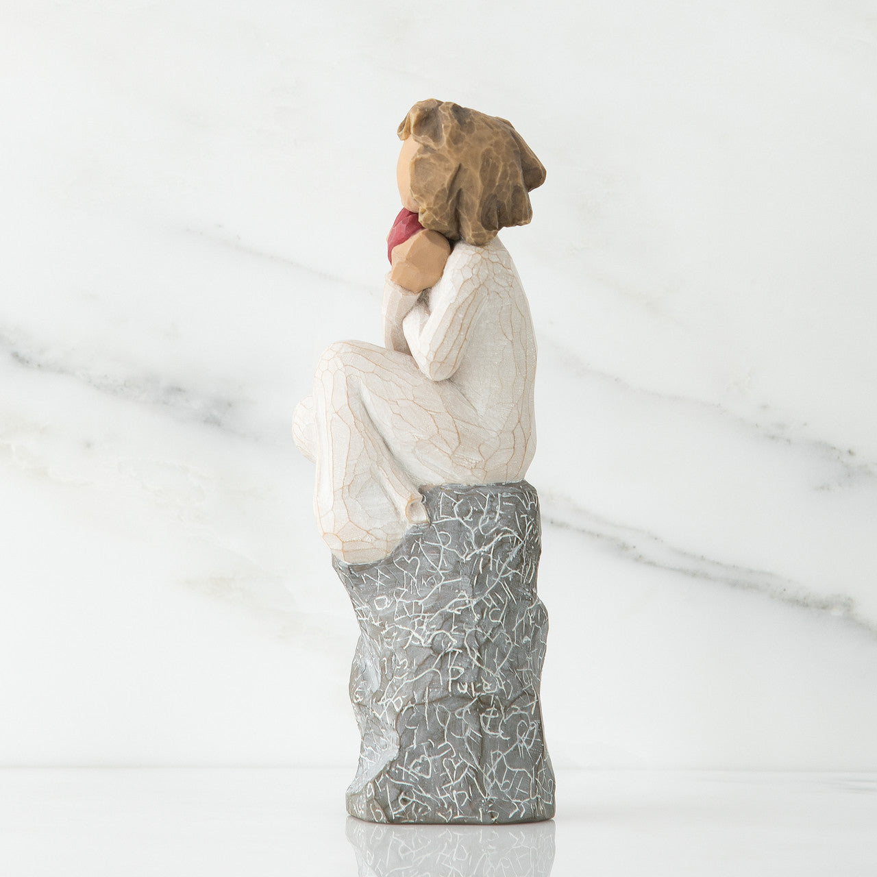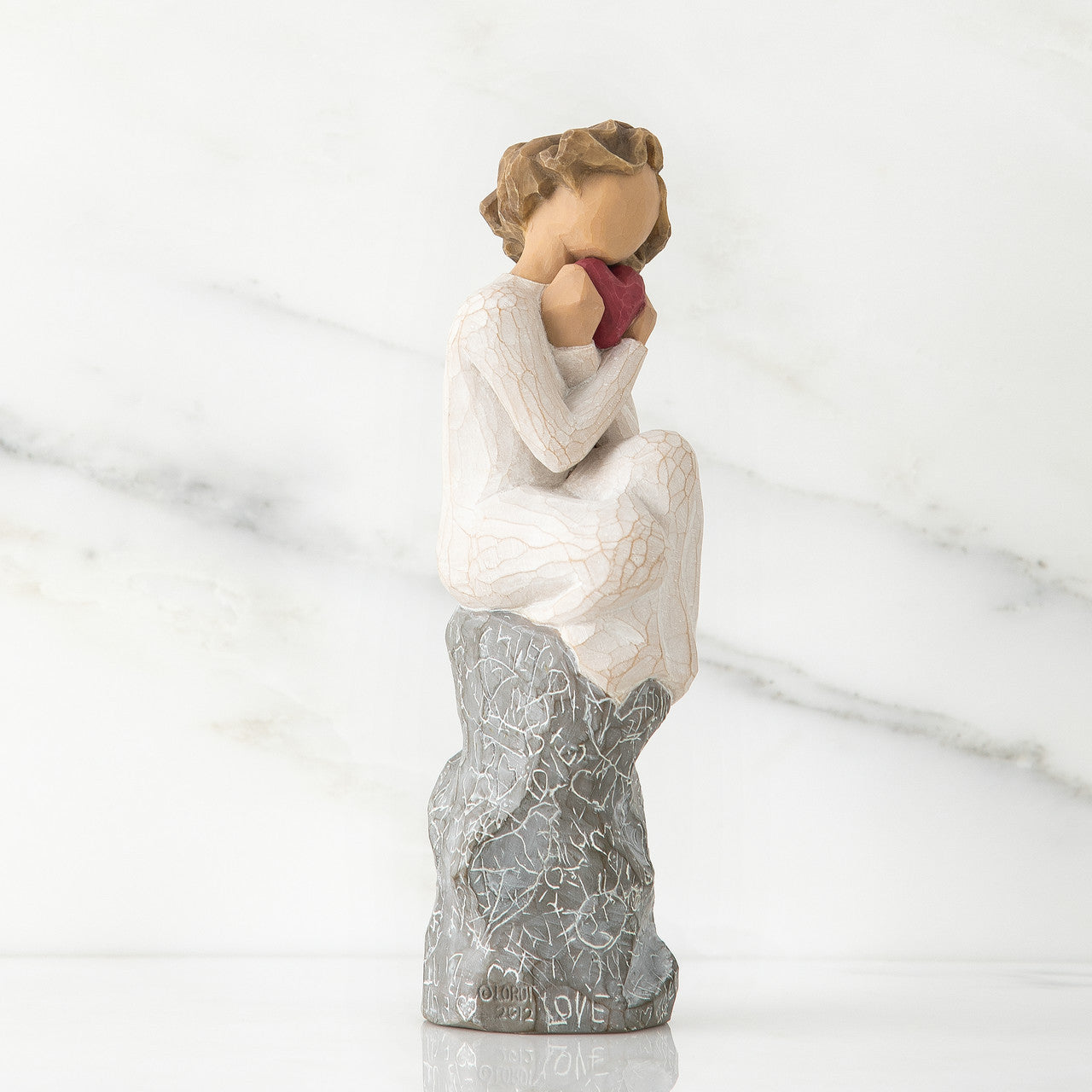 - Figure in cream dress, seated on a gray rock, with knees drawn up to chest, holding red heart up to face. Rock etched with words and symbols of love