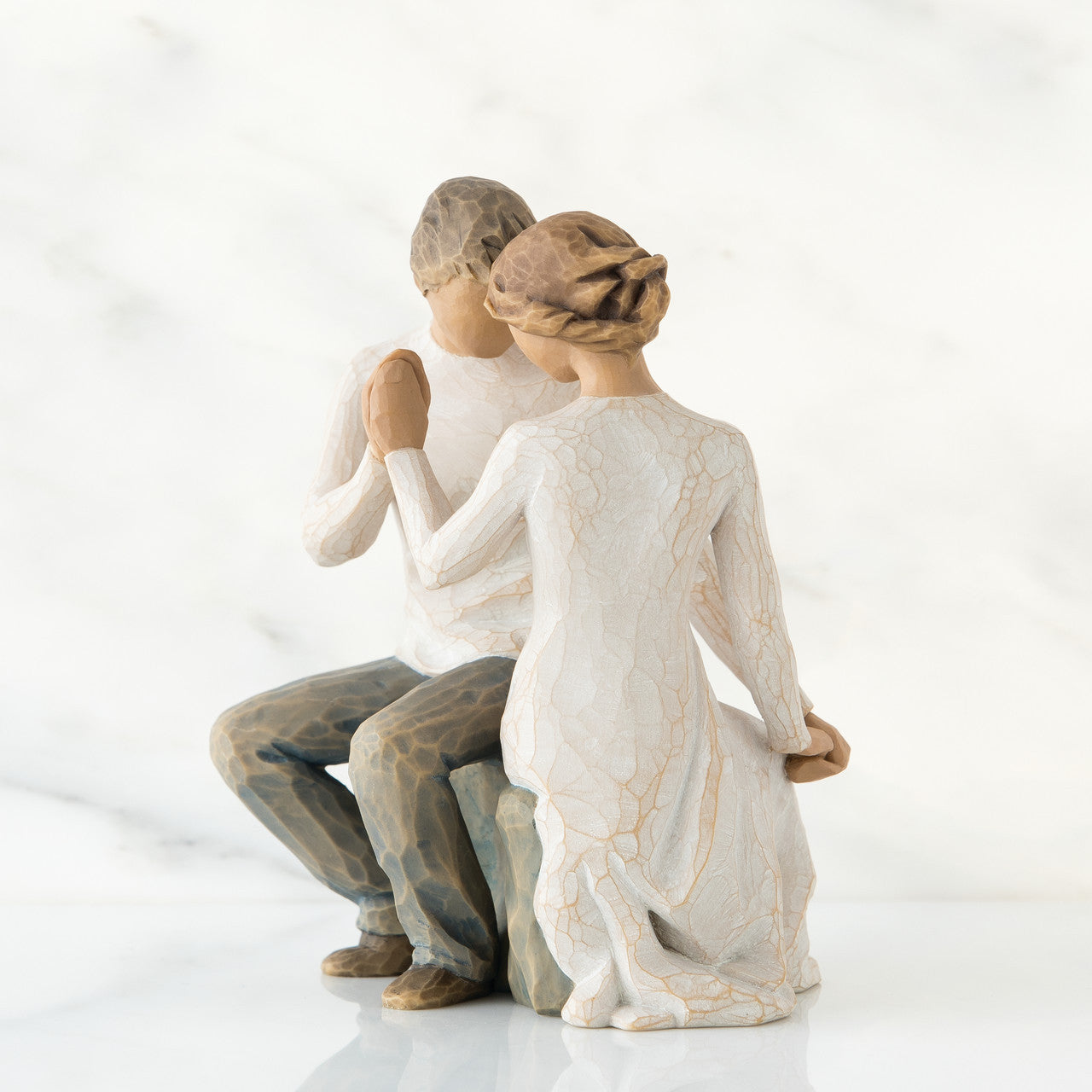 - Figure of couple seated across from each other, touching heads and hands. Man in cream shirt and dark pants; woman in cream dress with full skirt