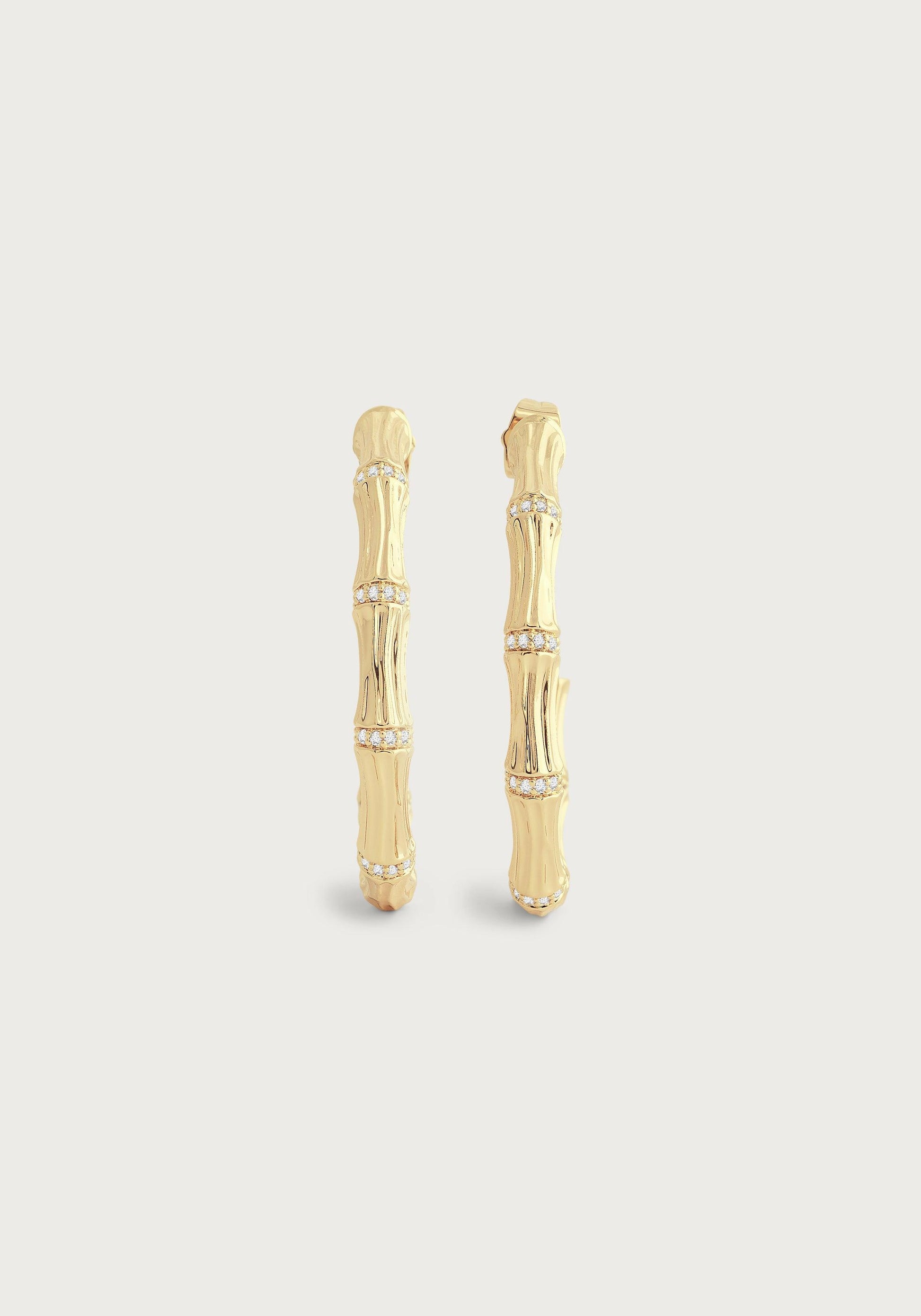 Fashioned from lustrous 18k gold-dipped brass and embellished with glistening crystals, these bamboo hoops boast a substantial presence, meticulously crafted for both opulence and ease of wear. Lively and luxurious, these bamboo hoops are the ultimate blend of glamour and comfort. Made with 18k gold-dipped brass and adorned with sparkling crystals, they're sure to make a statement with any outfit. Indulge in the best of both worlds - lavish style and effortless wear.