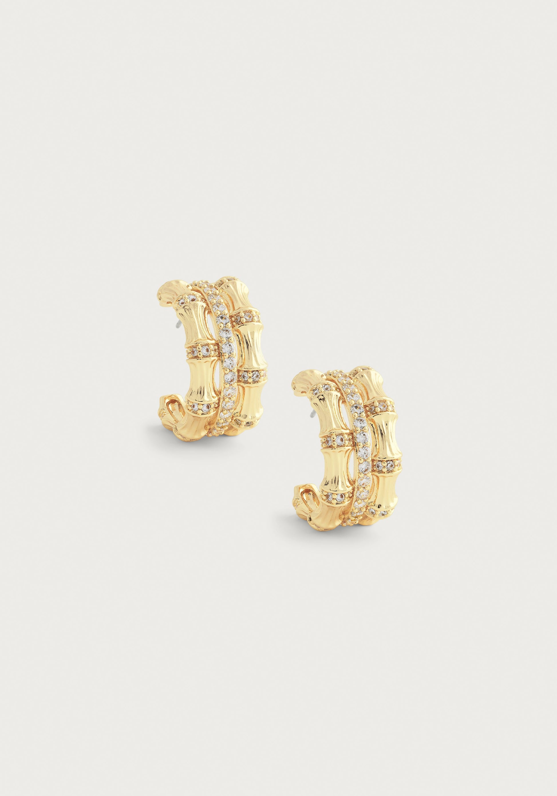 These earrings feature our best selling Bamboo Stacked Ring but in a timeless mini hoop. These 18k gold dipped pieces, with their exquisitely textured surfaces, are a captivating classic and a wardrobe staple. A stunning blend of nature and art, these hoops are the perfect statement piece for any outfit. Dress up any look with these 18k gold dipped beauties.