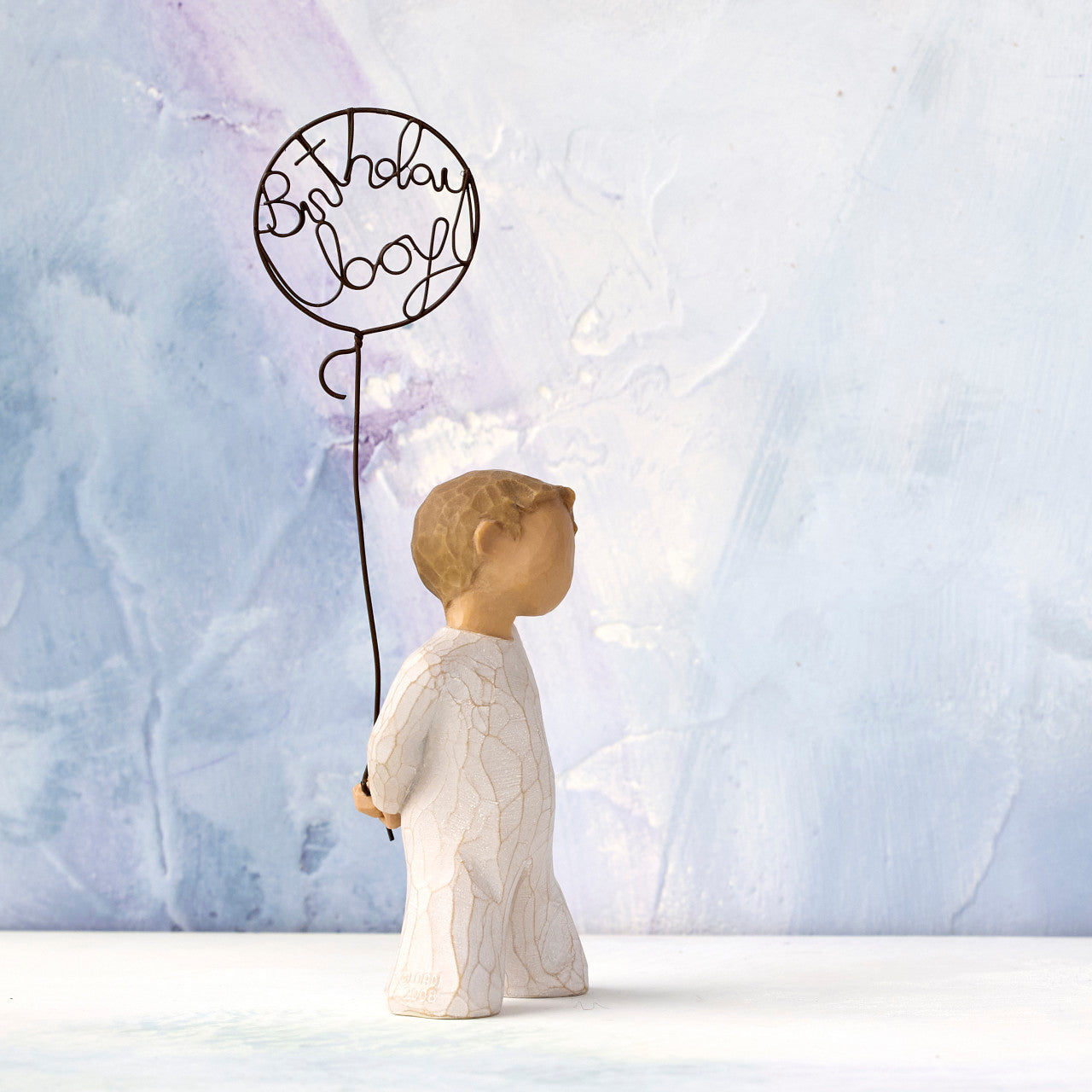 - Standing figure in cream onesie, holding wire ballon with the words 'birthday boy' written in wire inside it
