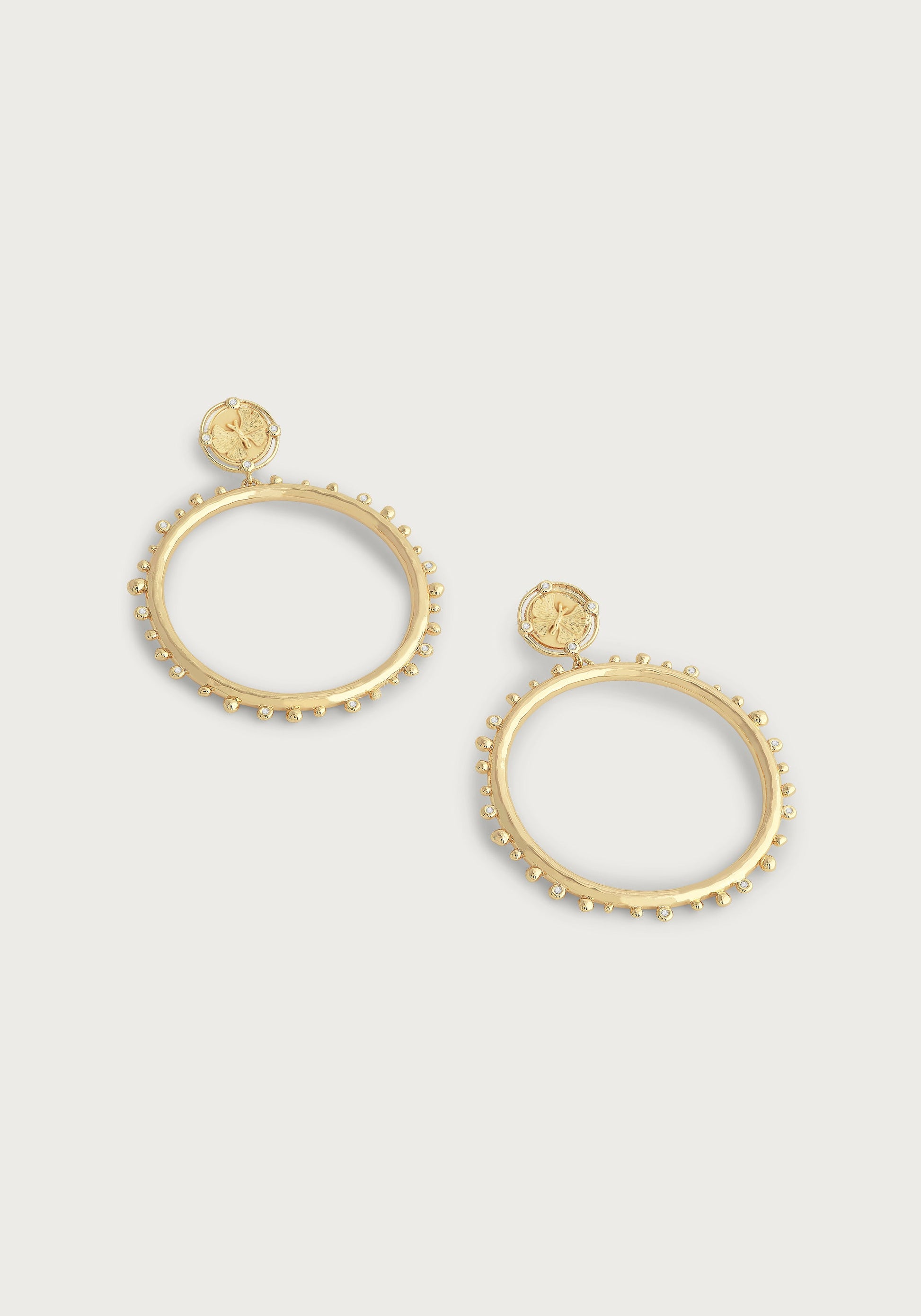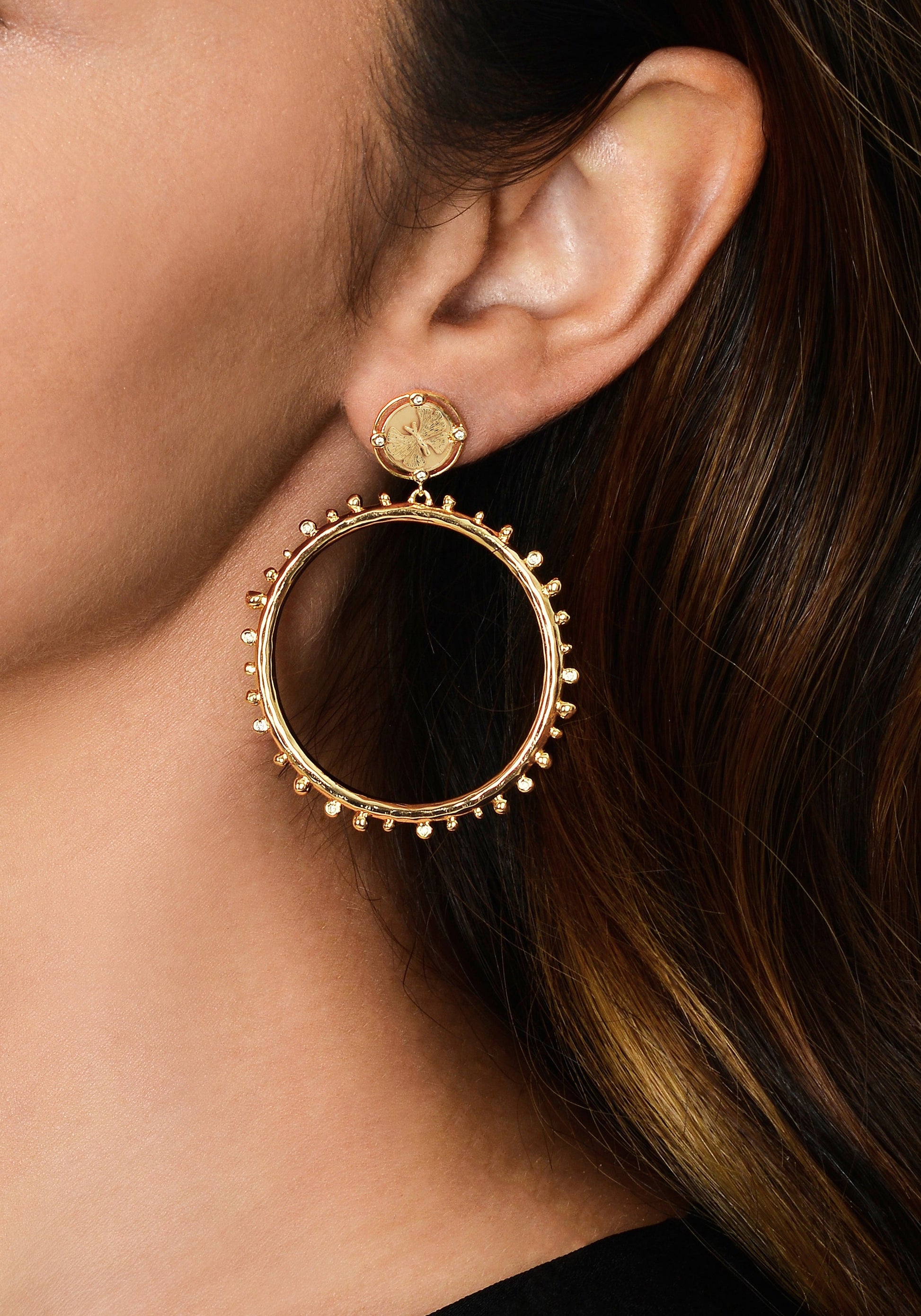 Handcrafted from 18k gold-dipped brass, these exquisite earrings feature coins emblazoned with Anabel Aram's signature butterfly motif, as well as sparkling crystals that catch the light beautifully. The unique “molten” droplets which encircle the hoops add an organic element to a modern classic, making them easy to wear for any occasion.
