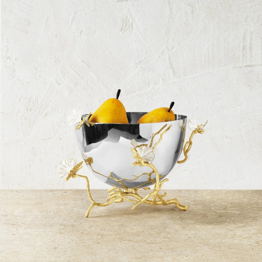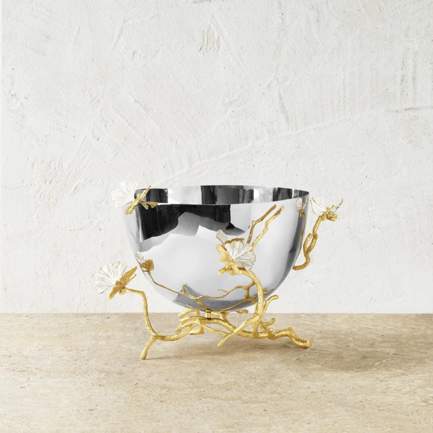 Handcrafted with exquisite attention to detail, the Butterfly Ginkgo Gold Bowl is a striking expression of luxury and artistry. Inspired by the graceful transformation of ginkgo leaves into fluttering butterflies, each bowl features sculpted natural brass branches, hand-polished to a rich gold tone, with delicate white enamel accents that lend an ethereal elegance. The stainless steel vessel reflects the golden forms with a mirror-like finish, enhancing their vibrancy and creating a sense of movement and wonder. Perfect for refined entertaining or as a decorative centerpiece, this piece embodies Michael Aram’s signature craftsmanship and poetic design sensibility.