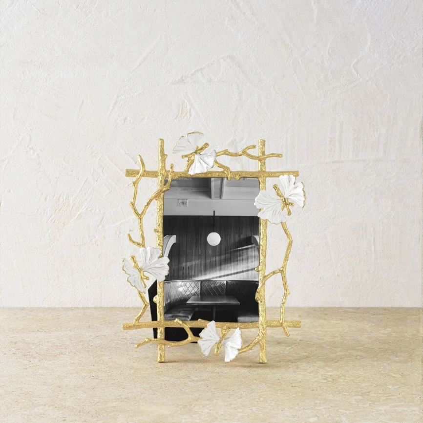 Celebrate life’s most cherished moments with the Butterfly Ginkgo Gold Frame. Handcrafted in goldtone metal and white enamel, each frame is a sculptural work of art inspired by the ginkgo leaf’s graceful transformation into flight. Michael Aram’s signature detailing captures the elegance of nature in motion, while the hand-polished finish adds a refined, luminous glow. A luxurious homage to one of Aram’s most iconic motifs, this frame is both a poetic keepsake and a timeless statement piece.