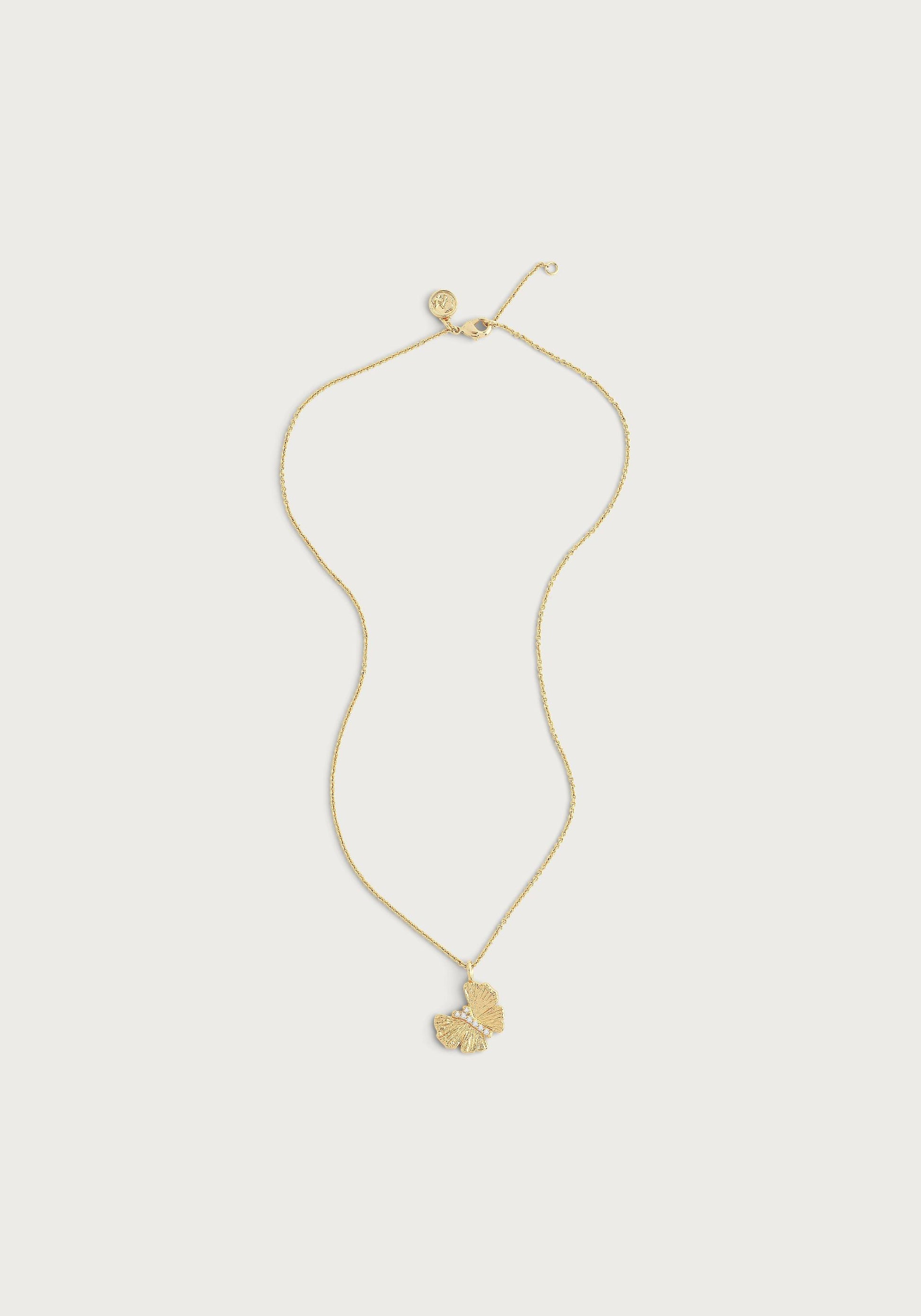 The butterfly necklace is hand sculpted and crafted in 18k gold dipped brass, accented with hand-set crystals that is adjustable in length. Make a statement with an exquisite butterfly necklace. Delicately carved from brass and dipped in gleaming 18k gold, this necklace is adorned with sparkling hand-set crystals. Plus, you can easily adjust the length to suit your style. Don't miss out on this luxurious and versatile accessory!