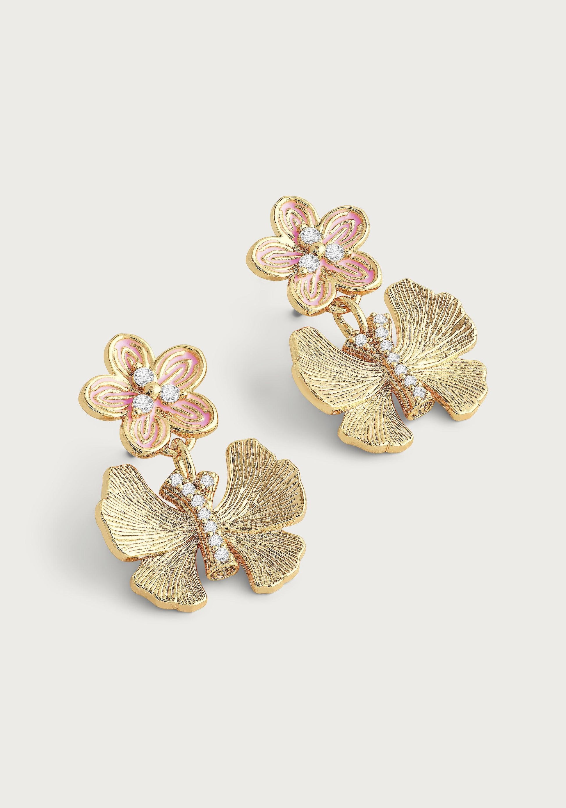 These earrings are crafted from 18k gold dipped brass and feature bejeweled butterflies and pink accented flowers. These artfully sculpted pieces are an elevated and playful addition to your jewelry wardrobe, making them the perfect accessories for any occasion. Add some whimsy and charm to your look with these unique butterfly and flower earrings. Crafted with 18k gold dipped brass, these earrings bring a touch of shine and color to any outfit. Perfect for any occasion, they're a fun and playful addition to your jewelry collection.