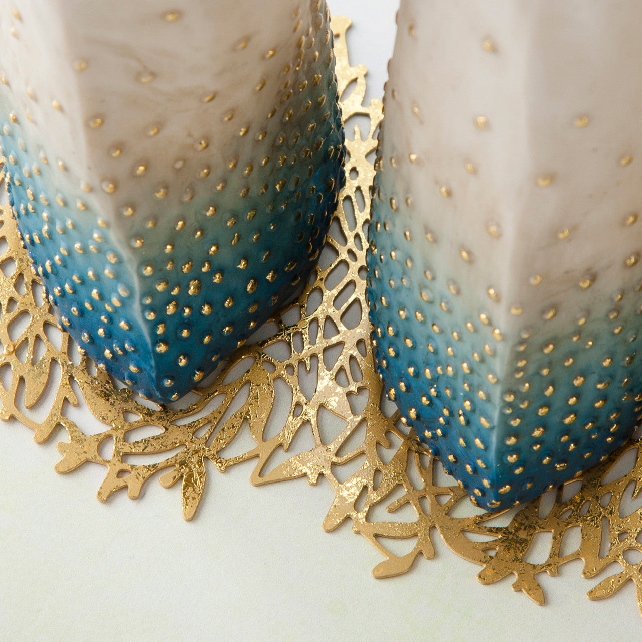 - Large sculpture of three tall women standing next to each other, attached to base of metal and gold-leaf. Figures in cream dresses, with skirts embellished in blue ombré and gold-leaf dots at base. Arms and hands of figures around each other