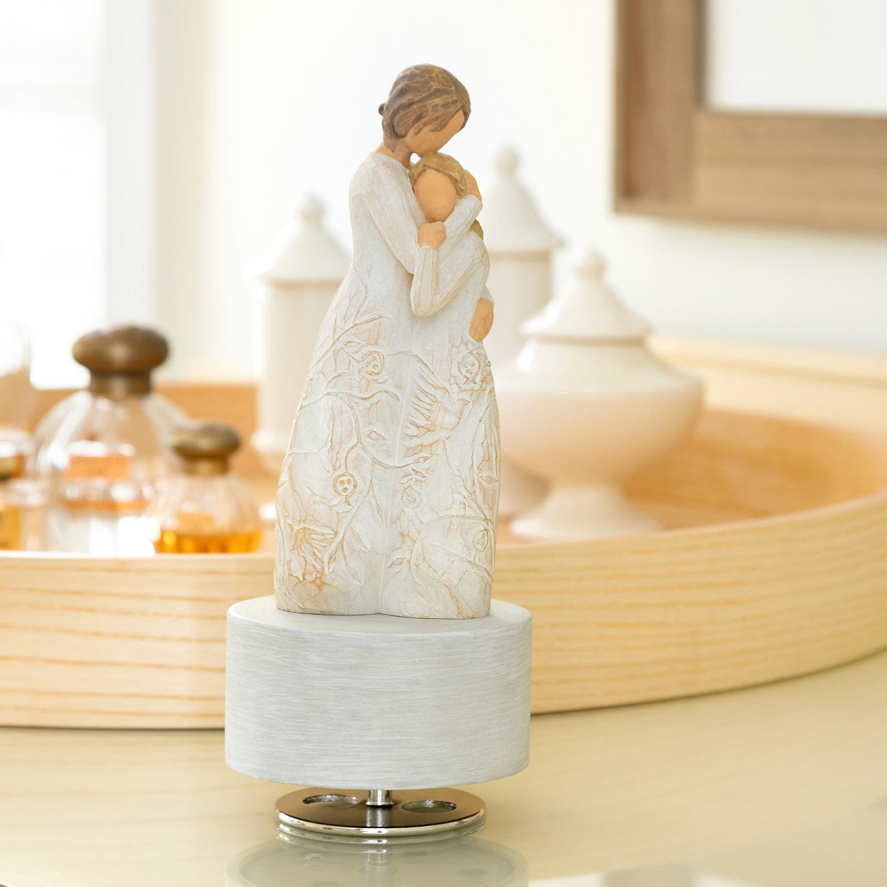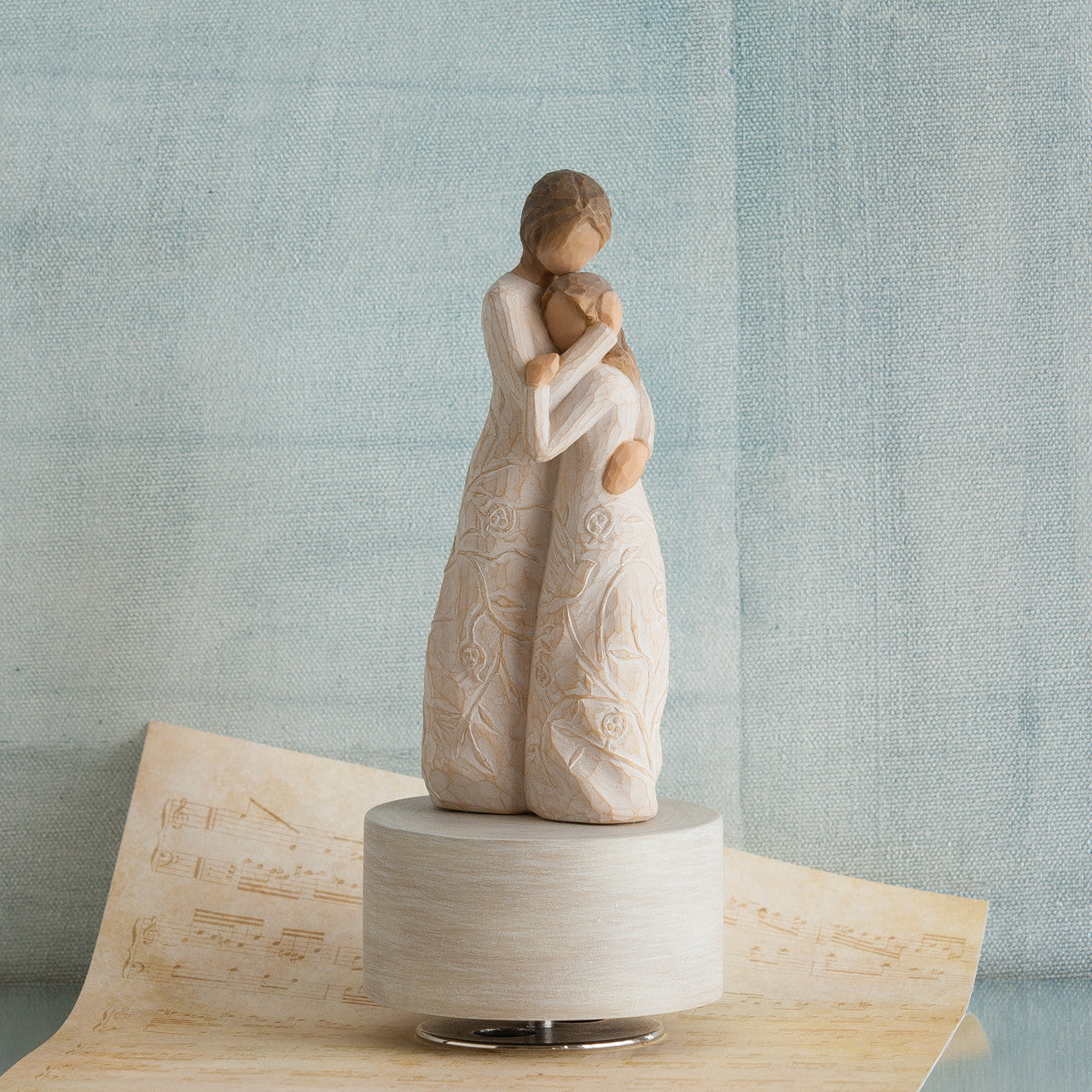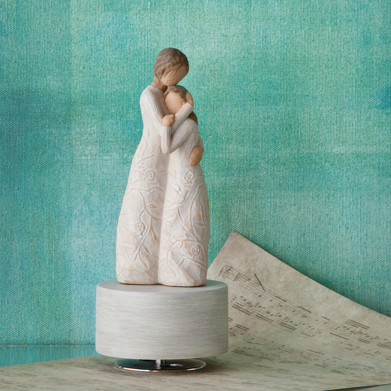 Music and movement transform this full-scale, beloved figure. The hand-painted base elevates the figure while it turns beautifully to the classic Debussy's ”Clair de Lune". As it turns, this intimate piece communicates an encircling of love and unconditional support between mother and daughter. "The sentiment applies to any age… a child going away to camp, a teenager leaving for college… the message is the same. The intertwined images carved on the figures’ dresses visually echo this sentiment. I understand this piece from both sides — having been a daughter, and having gone through the experience of raising a daughter to adulthood. I hope both mothers and daughters will connect to the emotions of this piece.” –Susan Lordi
