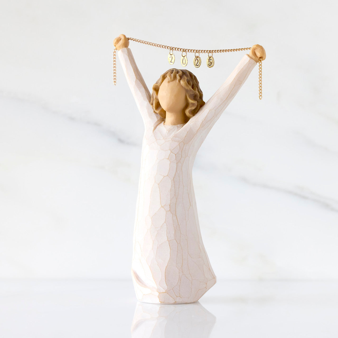 This figure holds aloft a gold chain with the year 2025 etched on separate gold medallions. A figure to mark important occasions such as weddings, anniversaries, births, graduations… milestones to celebrate and remember with joy