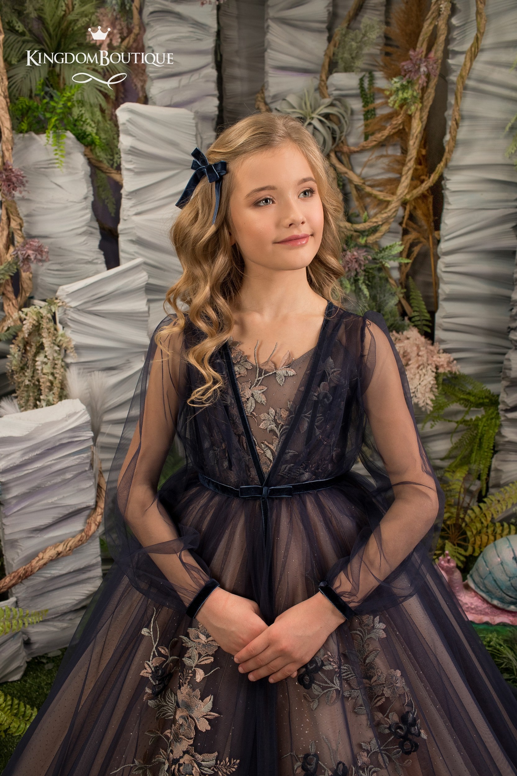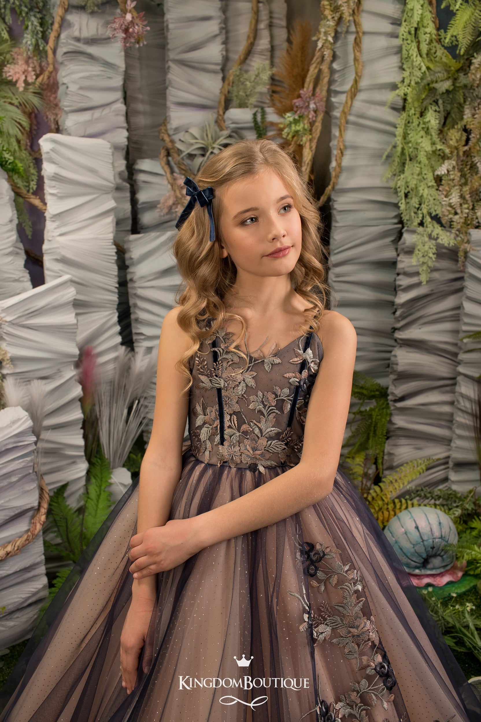 This is one of the mysterious and unique dresses in our collection. At first glance, it's blush pink with glitter, but thanks to the top layer of navy blue tulle covering the entire dress, it gets a touch of wizard and magician. Bodice and bottom of the dress in front and back embroidered by hand with floral lace. Perfect fit of the dress will be ensured by lacing and hidden zipper under it. Stylish navy blue long sleeve tulle cape covers all the dress with a train. It makes a little princess so mysterious!