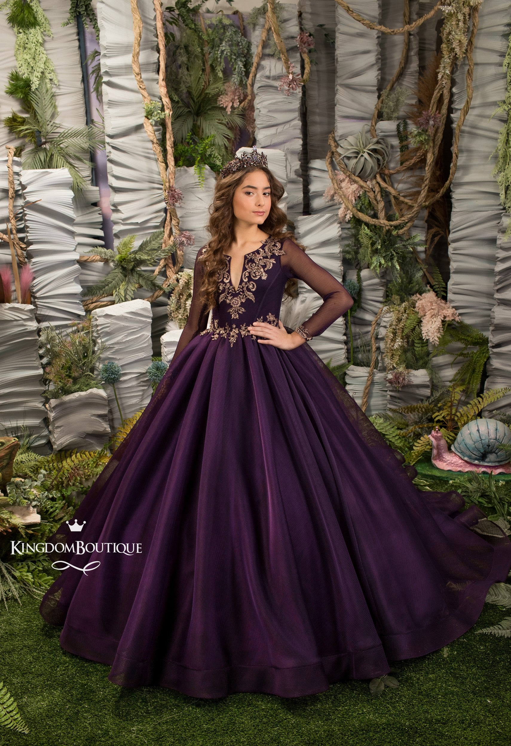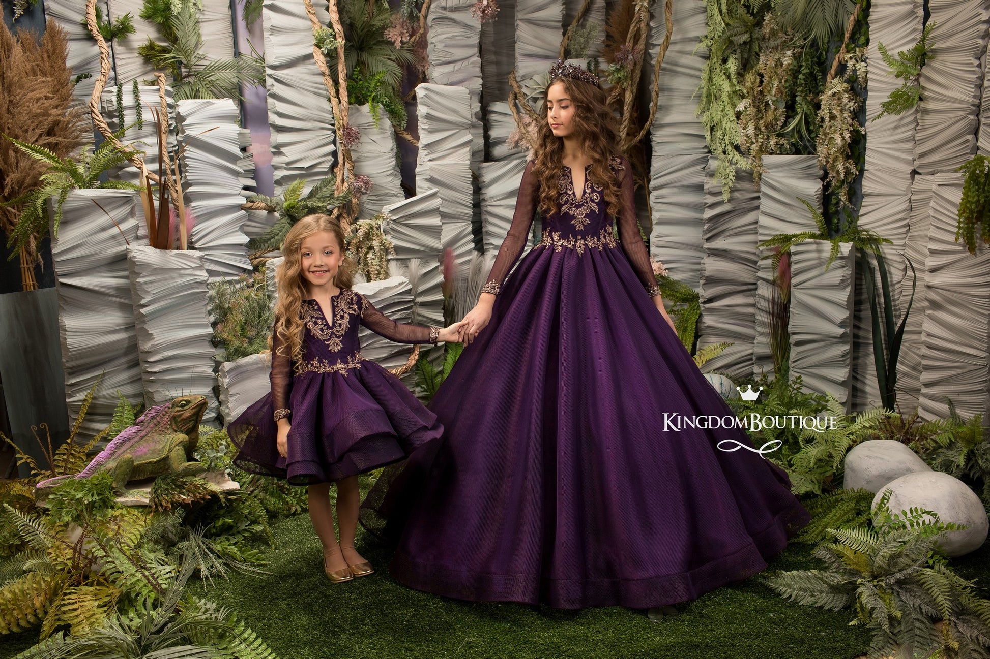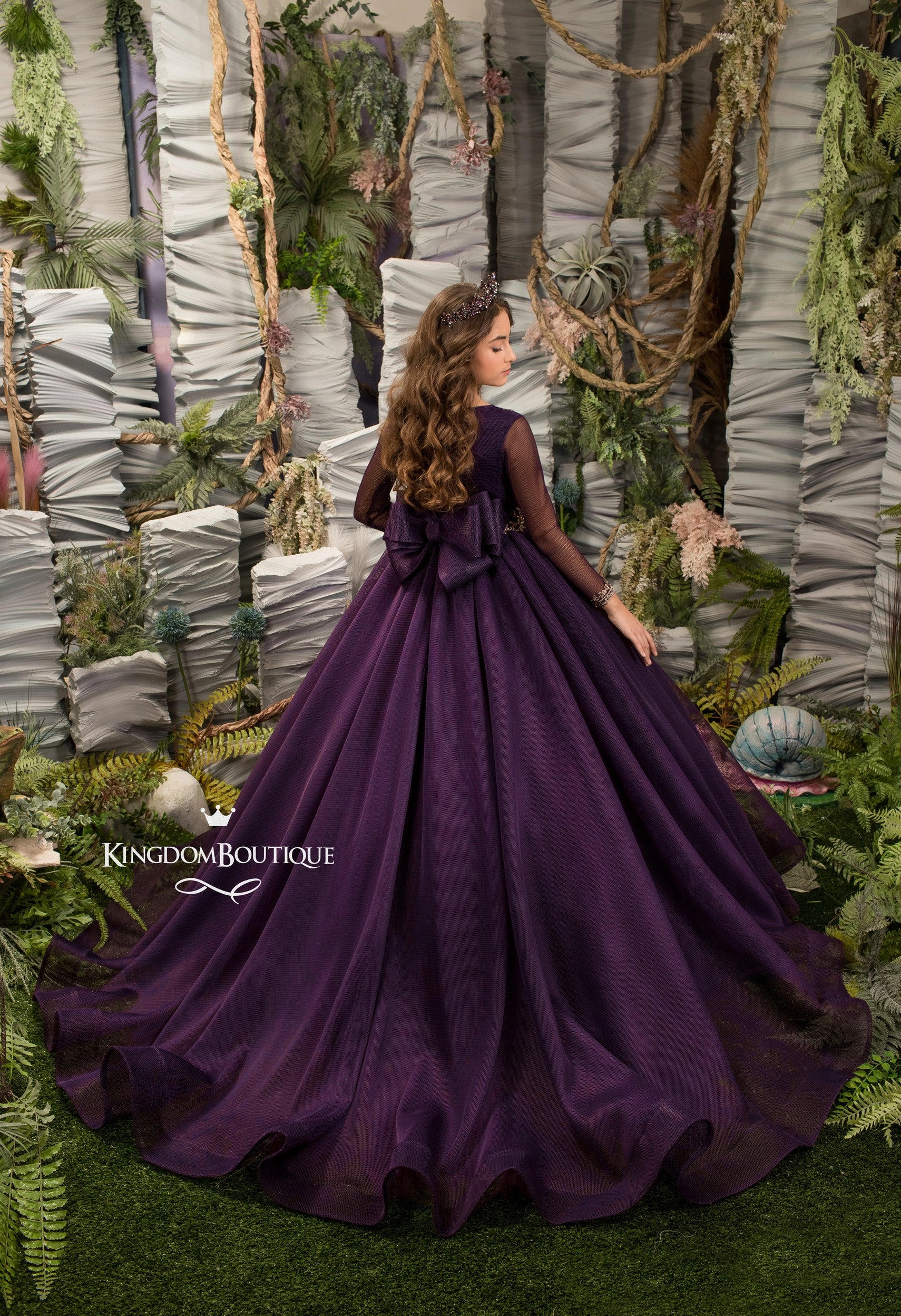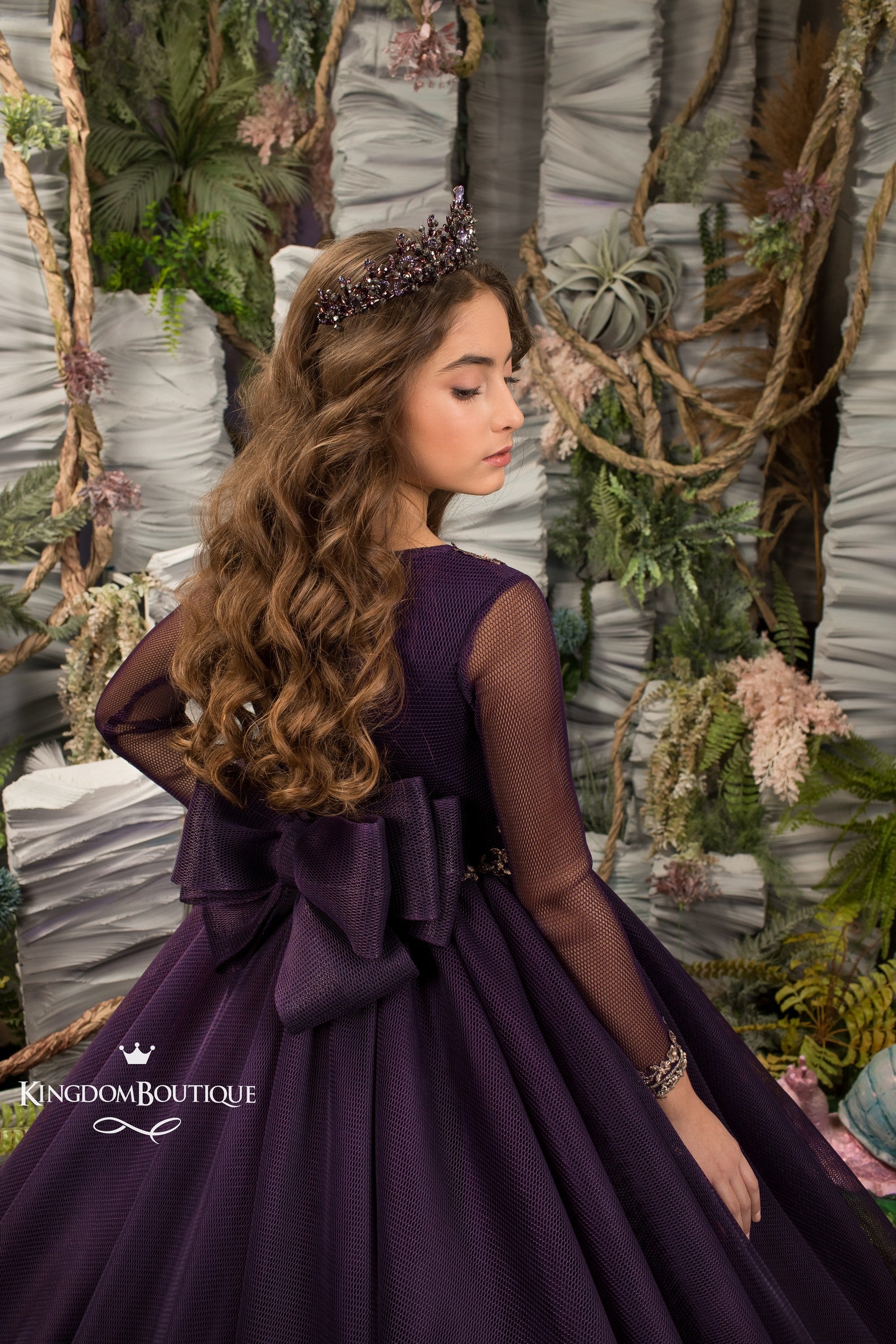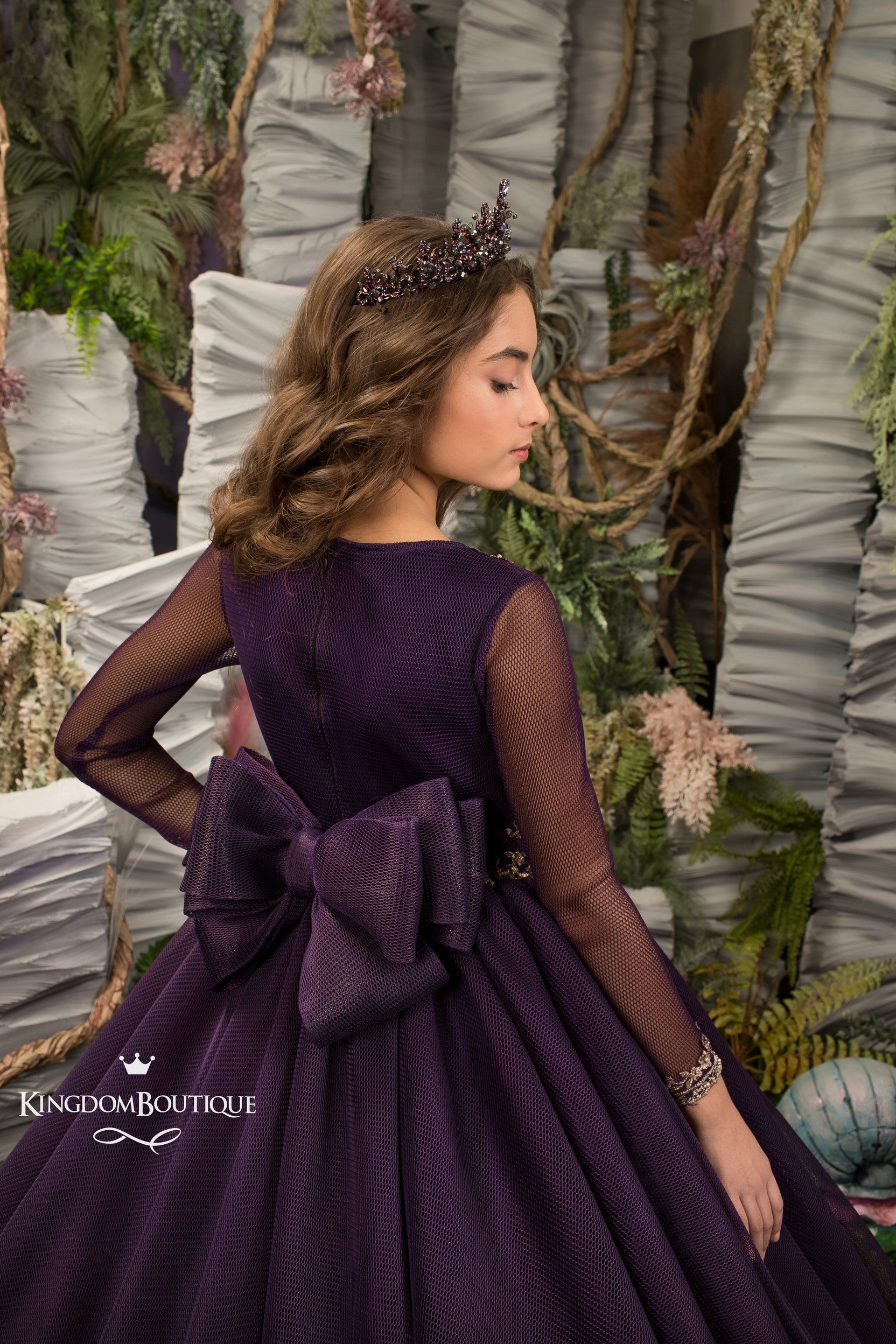 If your flower girl wants to delight everyone with a dress of the majestic queen - this outfit will be the best choice! Deep purple floor length dress made of high quality taffeta with delicate lace cover. The bodice of the dress in front is decorated with an original figured neckline, hand embroidered with floral elements and beads. This special occasion gown features sheer long sleeves, fastens with a zipper. Large gorgeous bow adorns the back of the dress. A wonderful tiara completes the royal look.