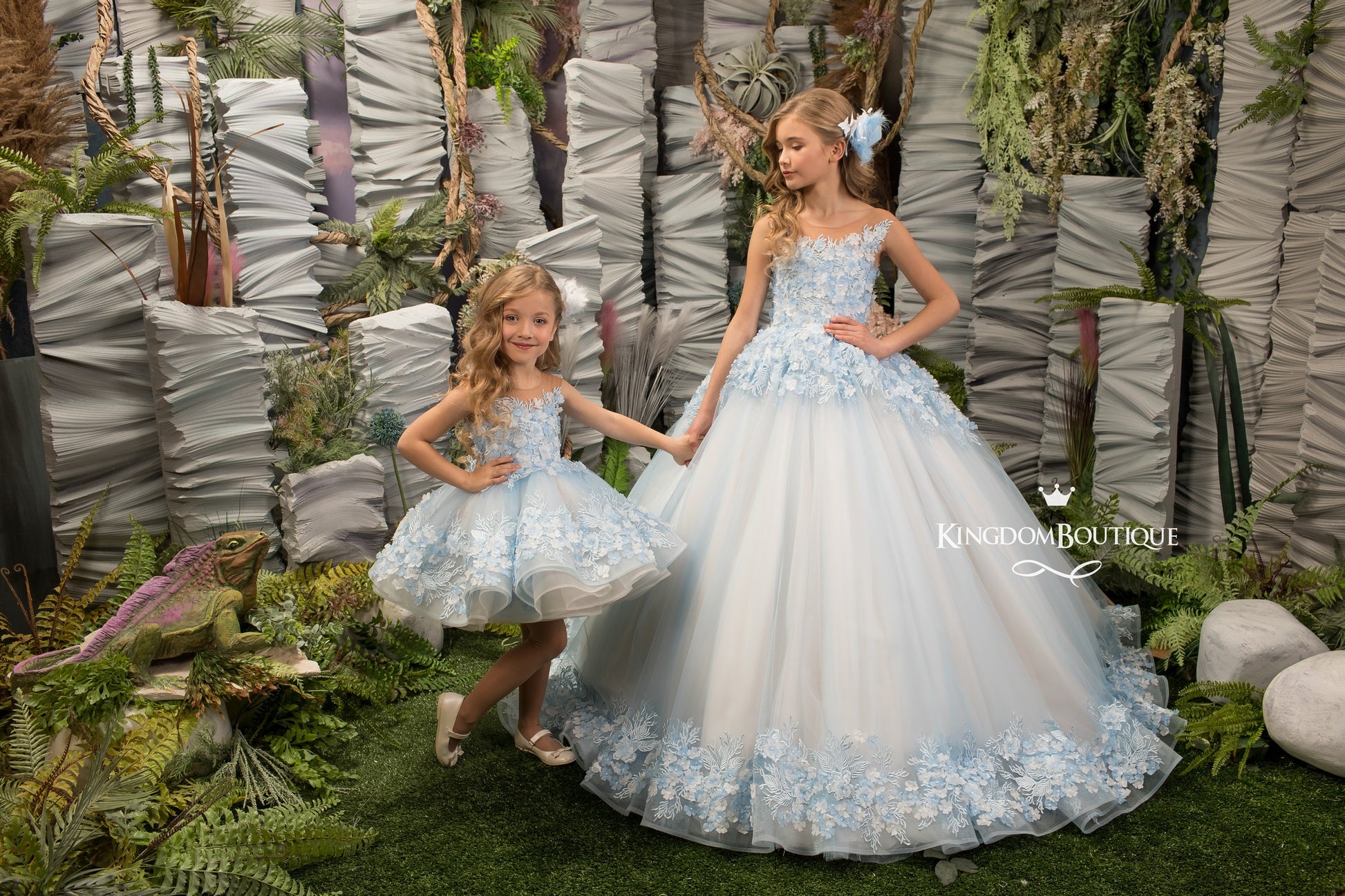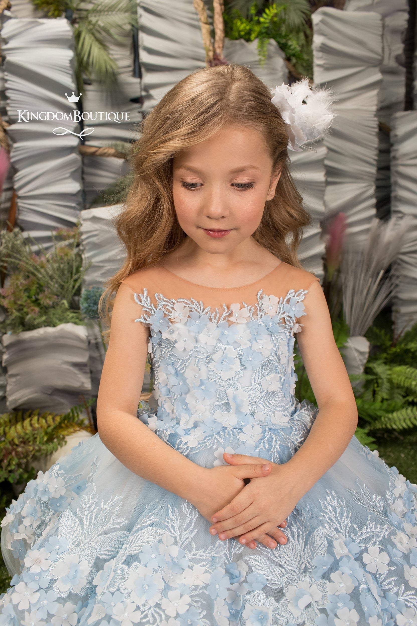 Our wonderful light blue knee length tulle dress embroidered on the bodice and skirt with a large quantity of delicate white and blue flowers. The dress is sleeveless with a multilayer tulle skirt bordered by horse trim ribbon, what gives it a special splendor. Perfect fit of this gown provides back lacing.The dress will be exquisite for a wedding, birthday or other special occasion.