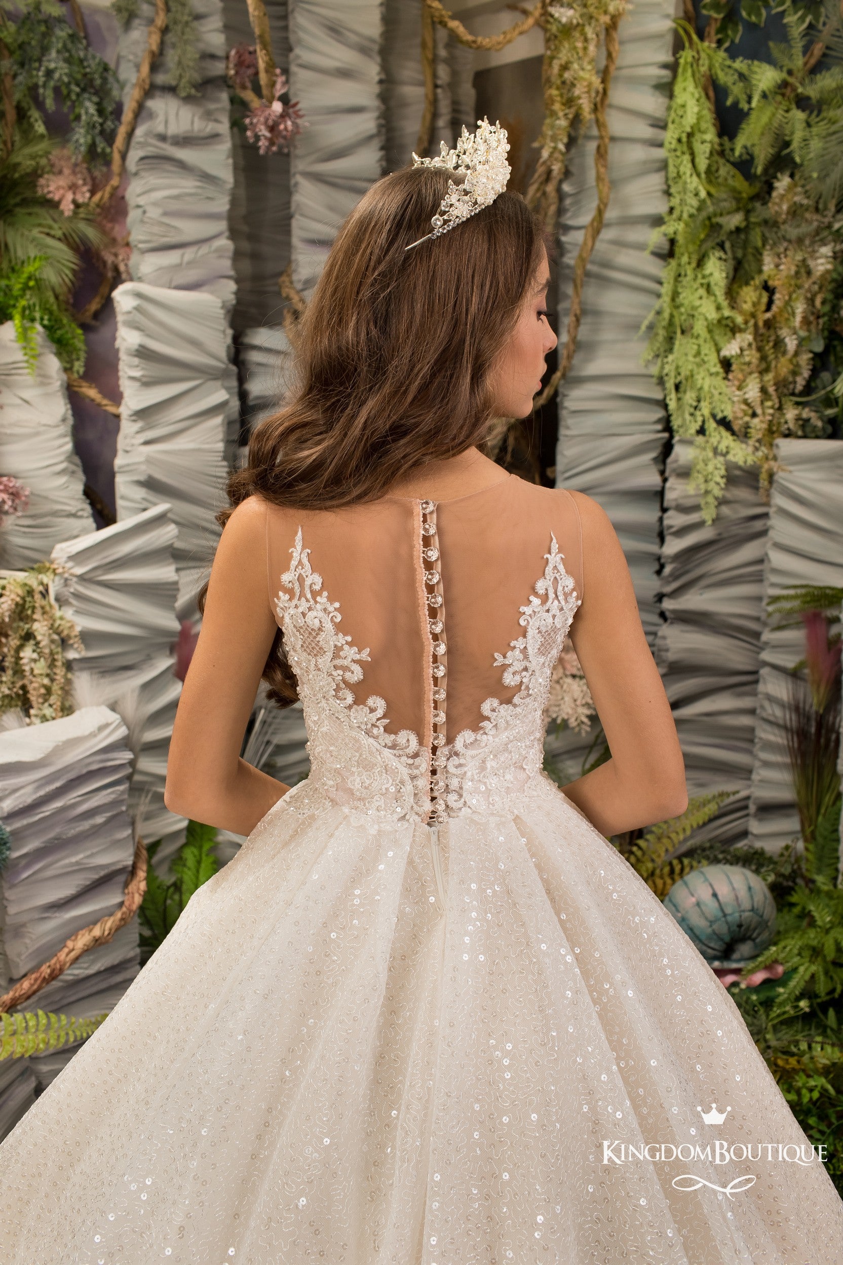 This ivory and champagne girl's dress with train features the sleeveless nude tulle bodice with lace embroidery and full floor length skirt. Beautiful lace with sequins all over the dress, rhinestones and crystal buttons make this gown incredibly attractive.