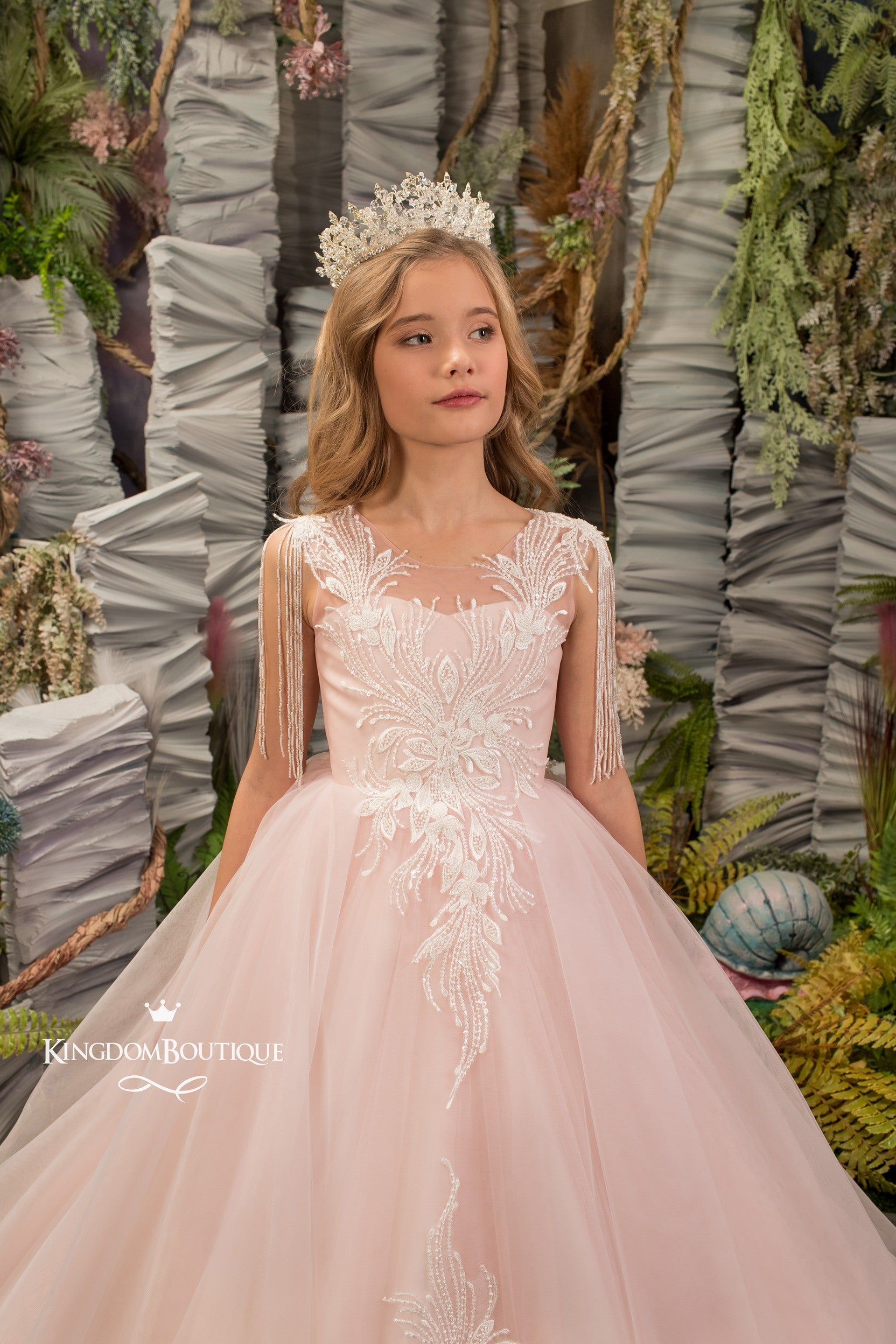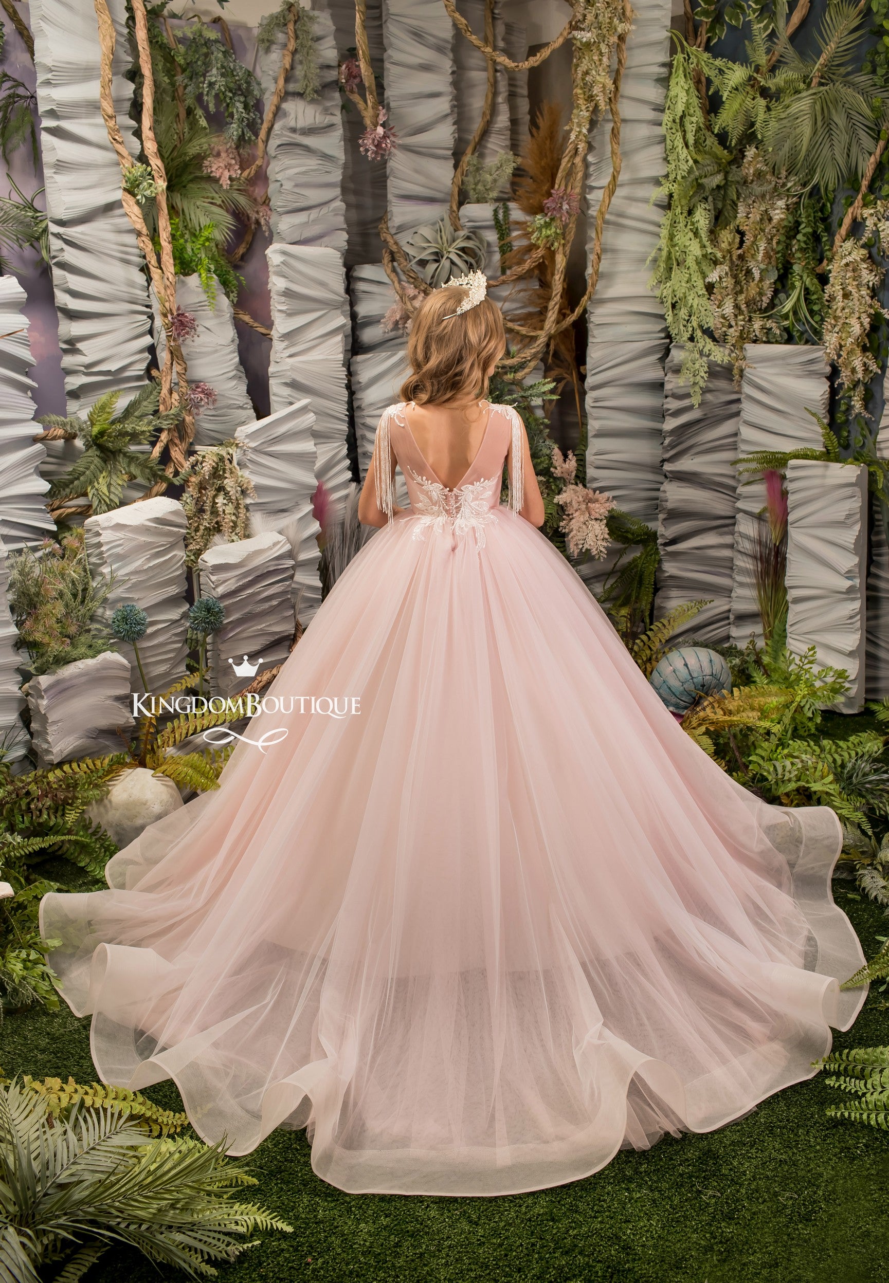 Kingdom Boutique dresses make kid's fashion world incredibly diverse and beautiful. Take a look at this stunning blush pink floor length tulle gown with train.
