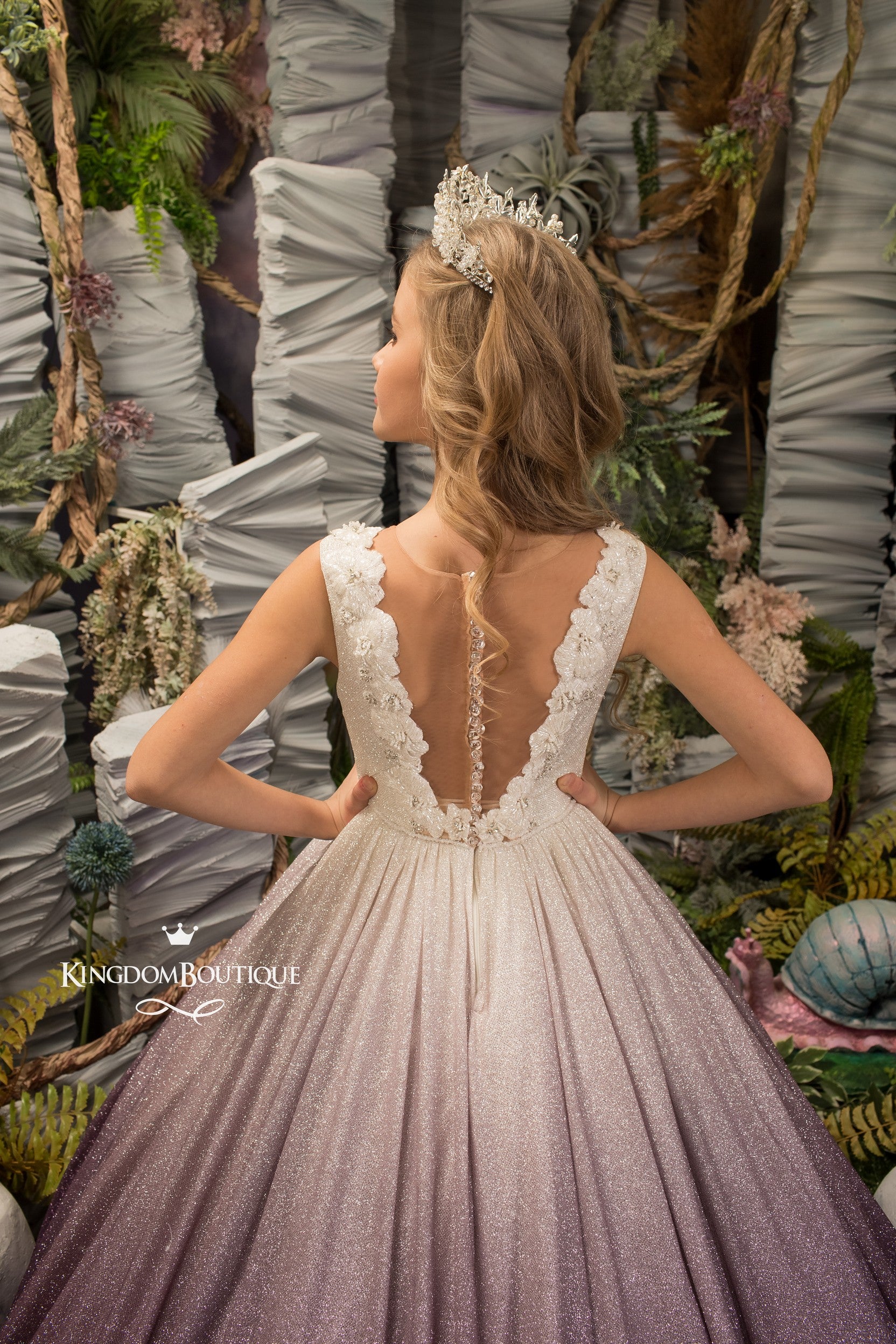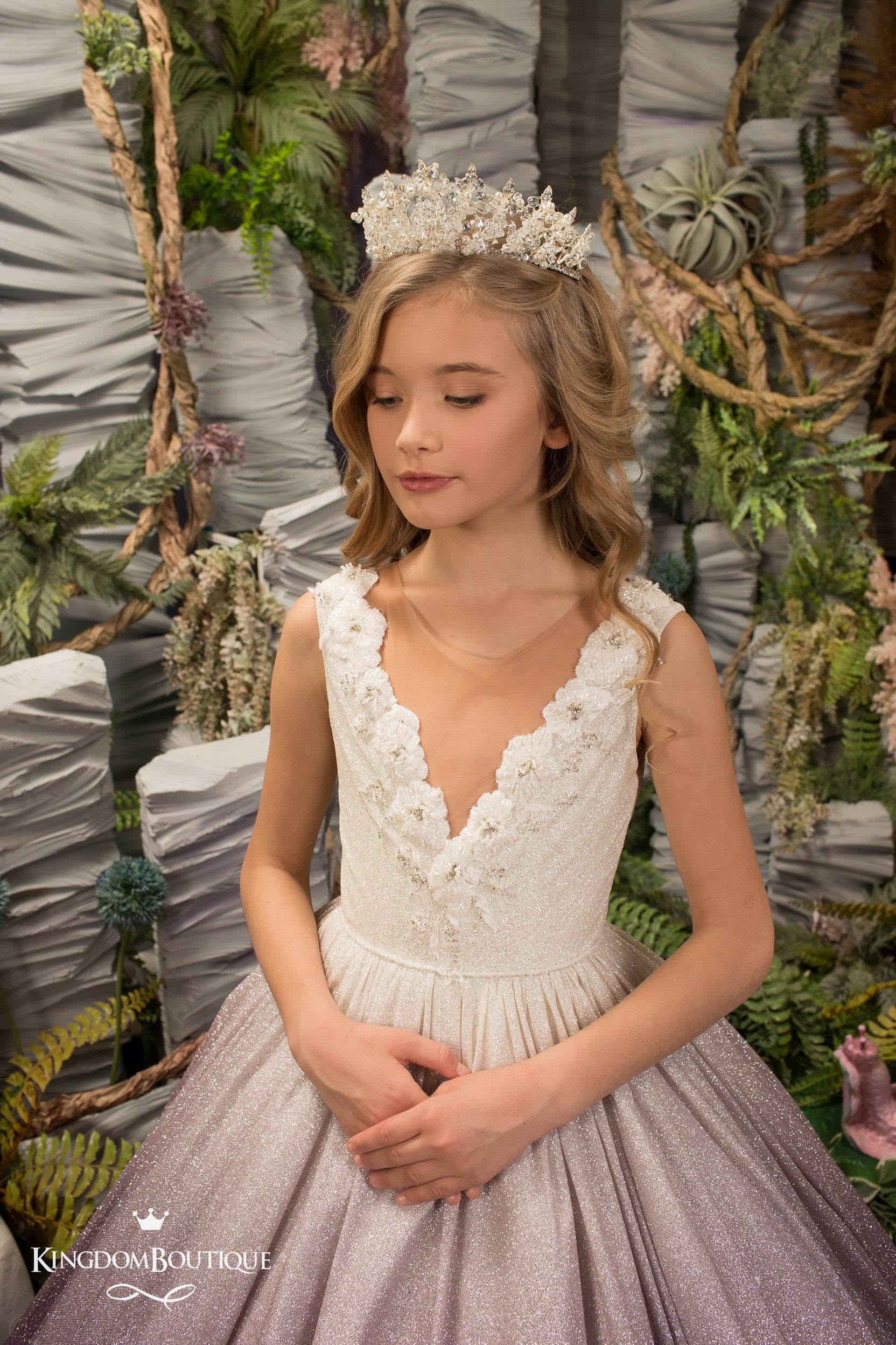 Our sparkling tiara would look particularly striking with this purple flower girl gown.