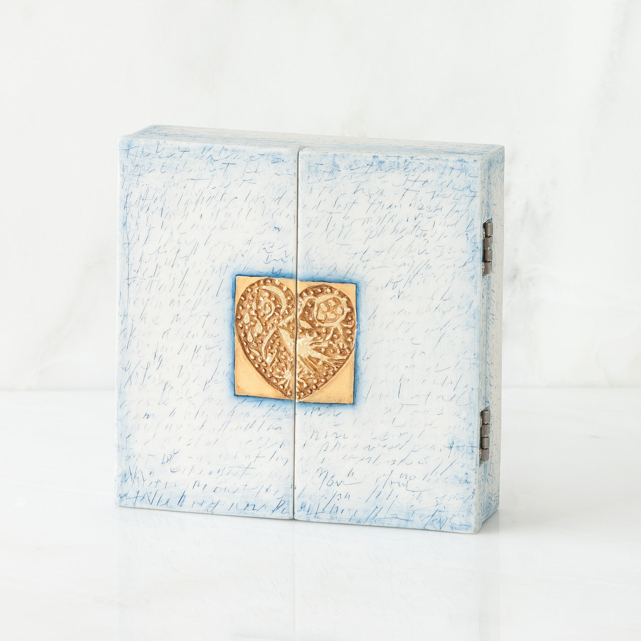 Duet is a very personal gift—small and intimate—sculpted in bas-relief inside a 4.75” square box that opens as a triptych to reveal a romantic scene, embellished with gold leaf. "I see Duet as a very personal gift, like giving a piece of jewelry; something small and treasured. When you open this love box, Duet, I hope you will think of the person who gave it to you, just like when you wear a piece of jewelry that you love." –Susan Lordi