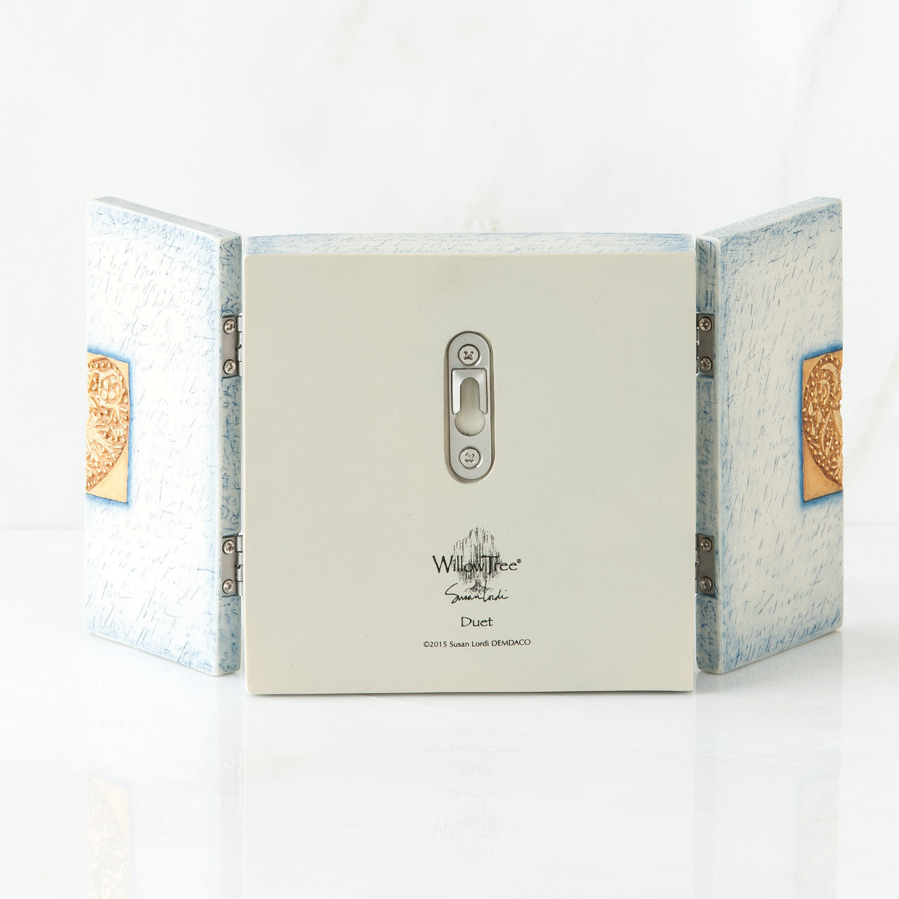A romantic Valentine’s gift, wedding or anniversary gift, given to one’s true love. Duet can be displayed open or closed, hung on a wall, or free standing. Hinged doors open flat or at an angle. Message on doors: “You are my one true love”.