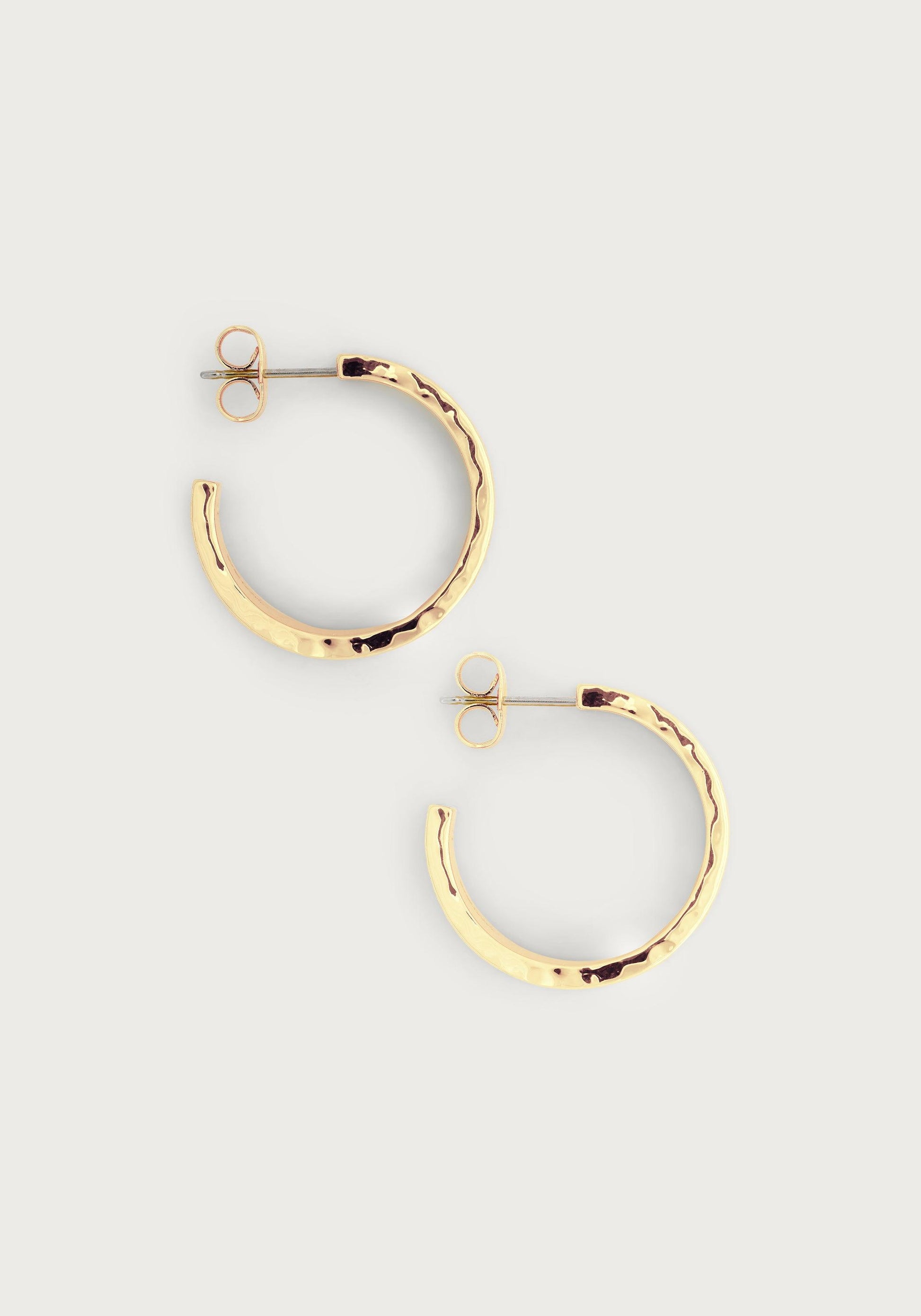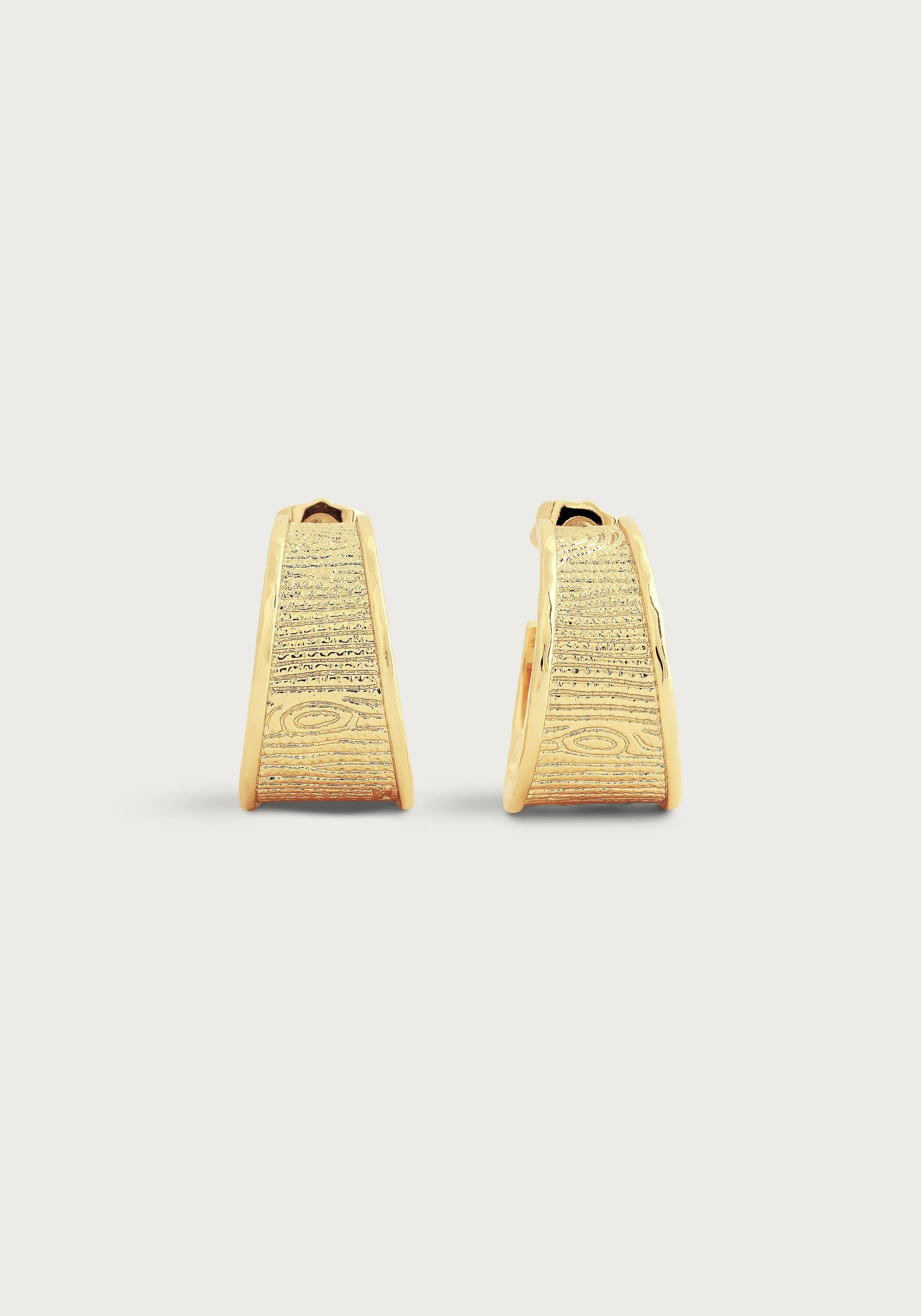 These earrings feature micro-hammered outer bands which frame a subtle sculptural woodgrain motif. These 18k gold dipped pieces, with their exquisitely textured surfaces, are a captivating classic and a wardrobe staple. A stunning blend of nature and art, these hoops are the perfect statement piece for any outfit. With their intricately textured surface and subtle woodgrain design, these earrings are a must-have for any fashion lover. Dress up any look with these 18k gold dipped beauties.