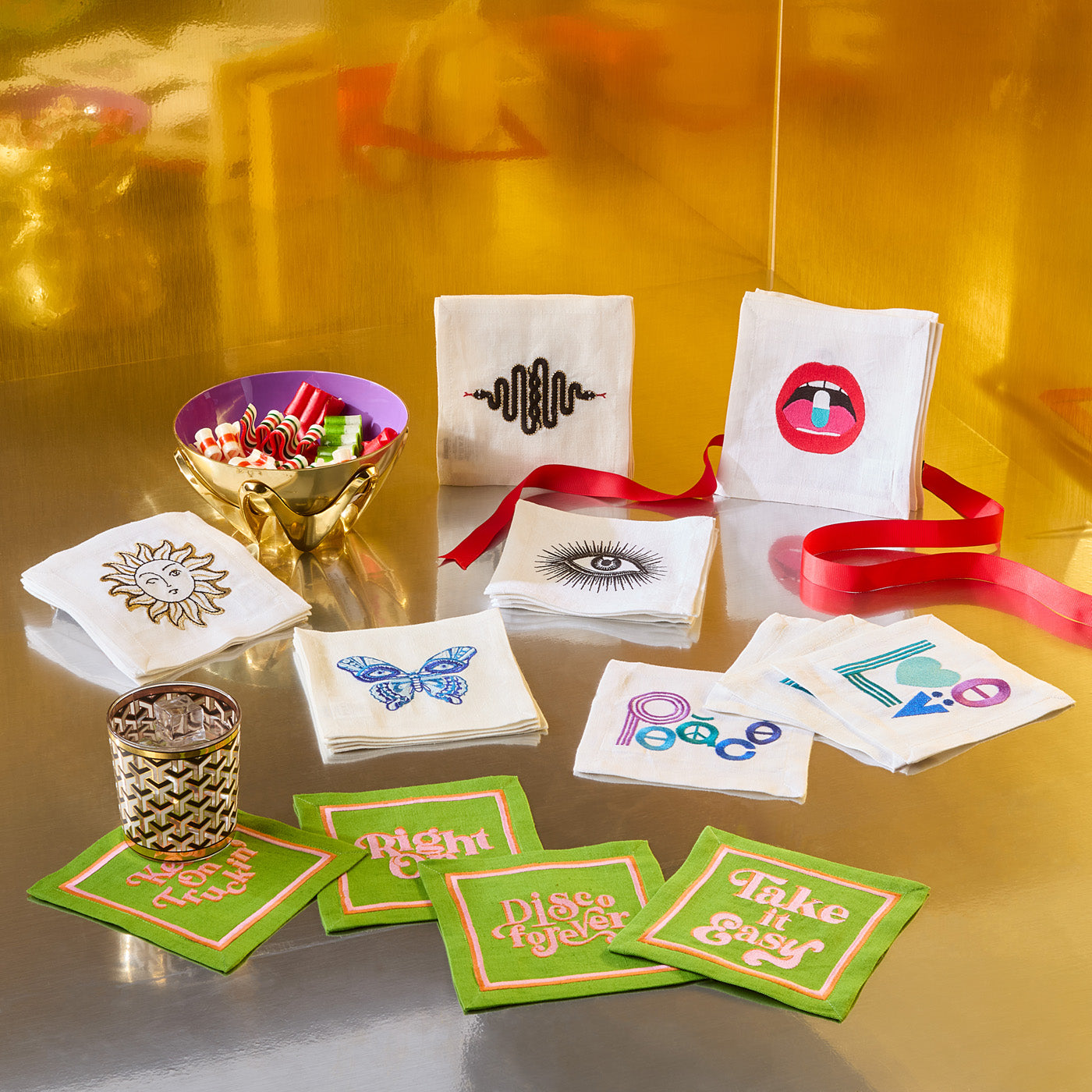 The perfect pairing with cocktails and canapés, these beauties even elevate basic bar nuts. Embroidered on luxe linen, our alluring eyes add an elegant and avant-garde touch to your evening.