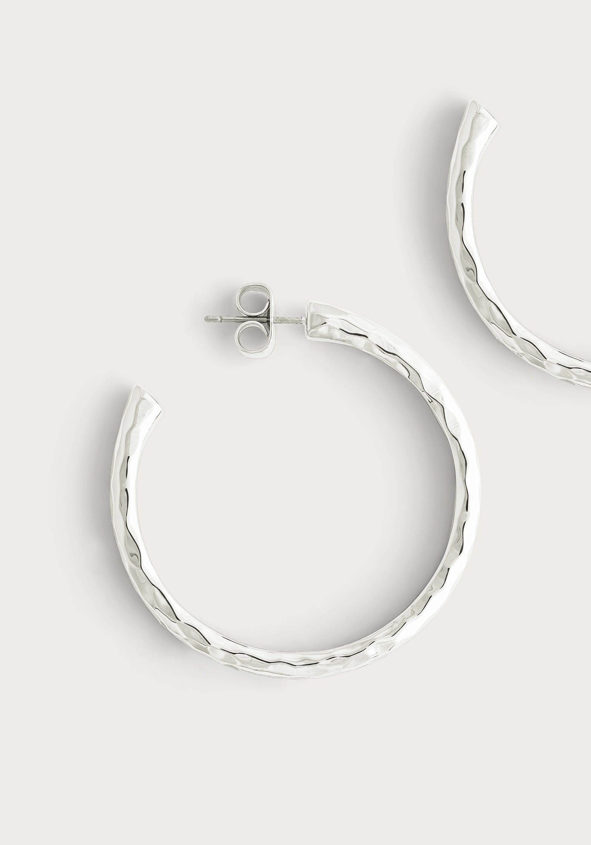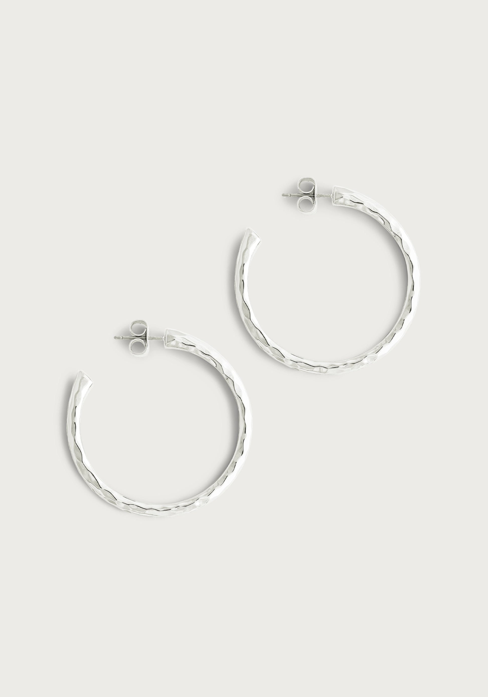 The Farrier Medium Hoop Earrings is a stunning piece crafted from sterling silver plated brass, designed to embody the rugged beauty and refined elegance of traditional farriery. Each earring features a distinctive hammered texture, echoing the artisanal marks left by a blacksmith's hammer, which gives the exterior a unique, tactile surface. These medium-sized hoops are versatile, perfect for making a statement in both everyday wear and special occasions. Secure closures ensure that these earrings are both practical and stylish, making them a beautiful blend of tradition and modernity.