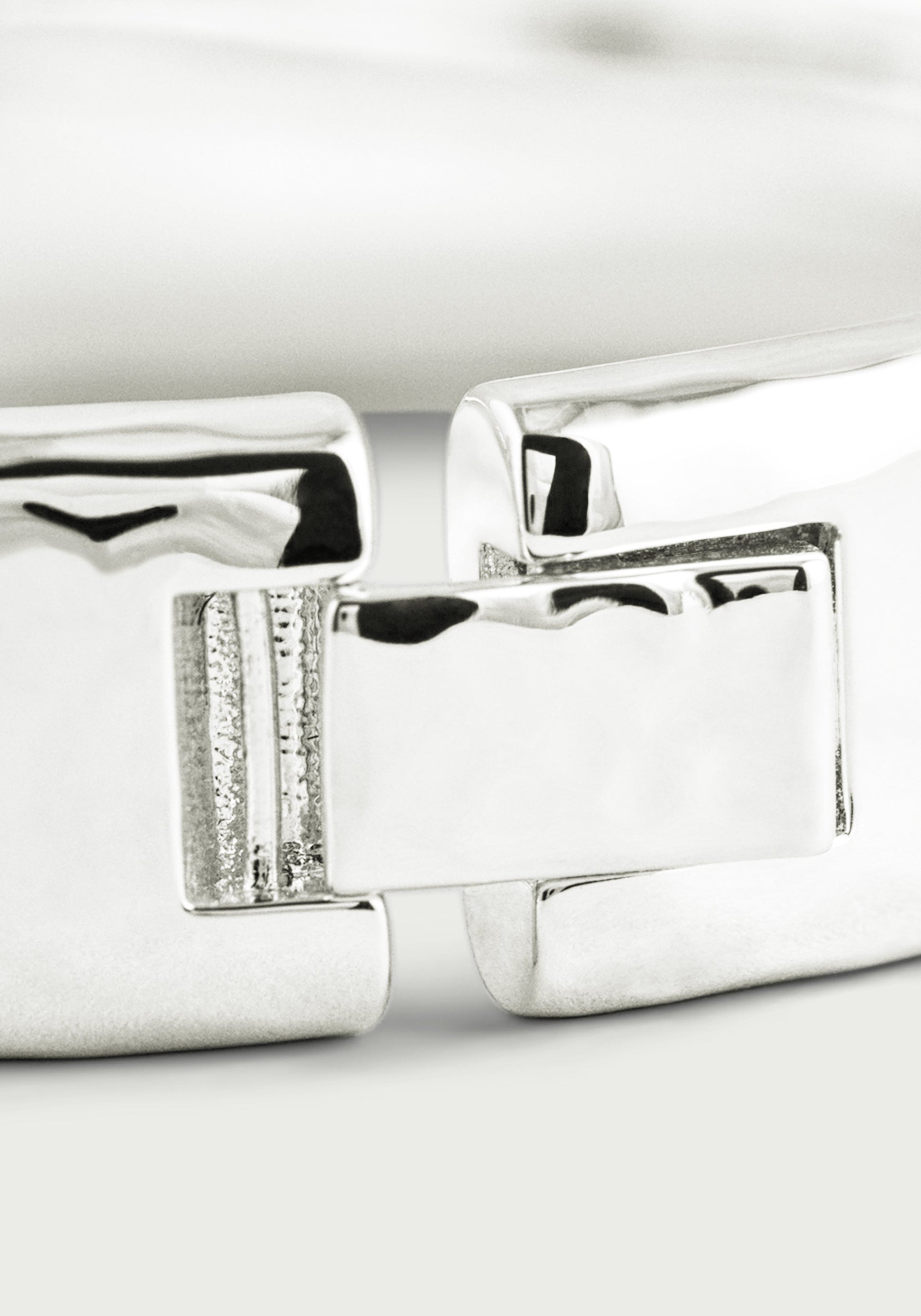 This modern and minimalist Farrier Wide Hinged Bangle in sterling silver plated brass, adds a timeless and classic touch to any outfit. Its hinged design makes it easy to wear and stack with other bracelets, while the hammered texture adds a statement element. Elevate your style effortlessly with this versatile piece.