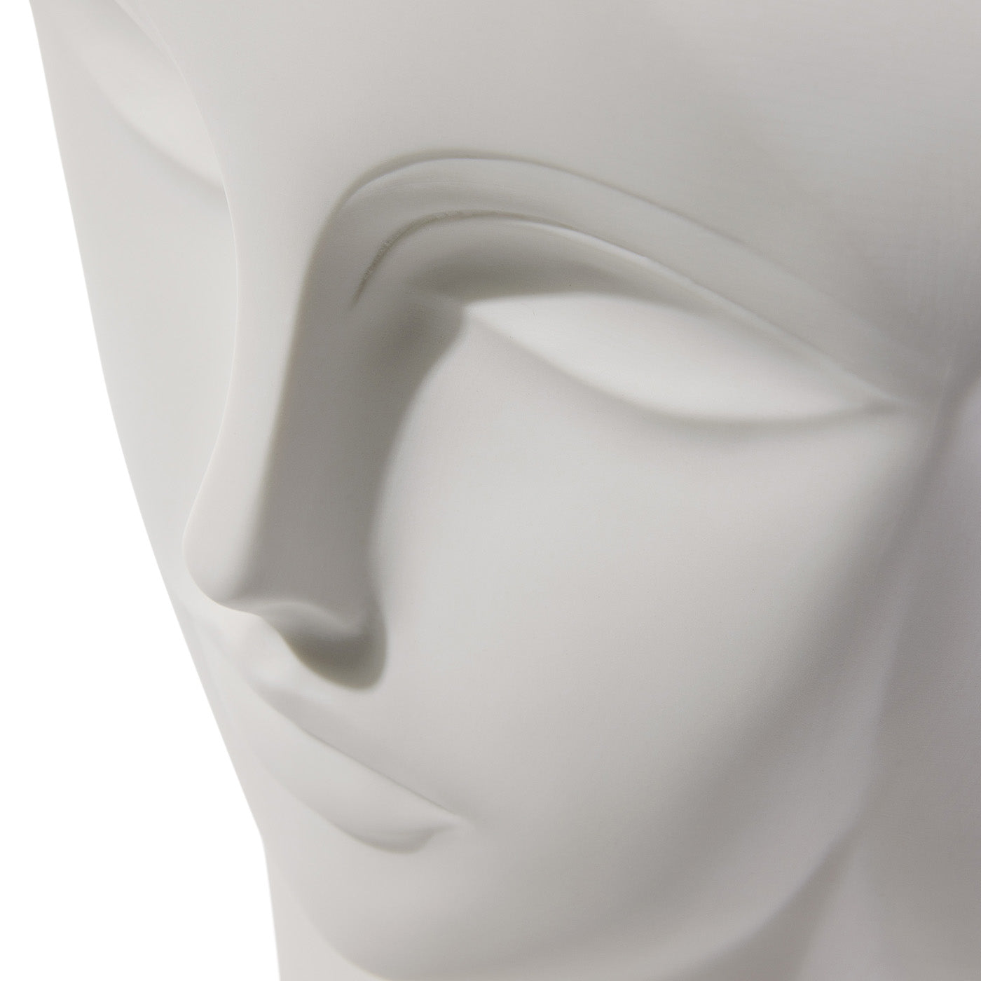 Our oversized take on a traditional ginger jar. We took our muse Giuliette's almond shaped face and placed her on a stepped base, then topped her with a Deco-inspired lid. A sublime mix of soft and architectural lines. Crafted from classic matte white porcelain and featuring our muse's ethereal face on all four sides.