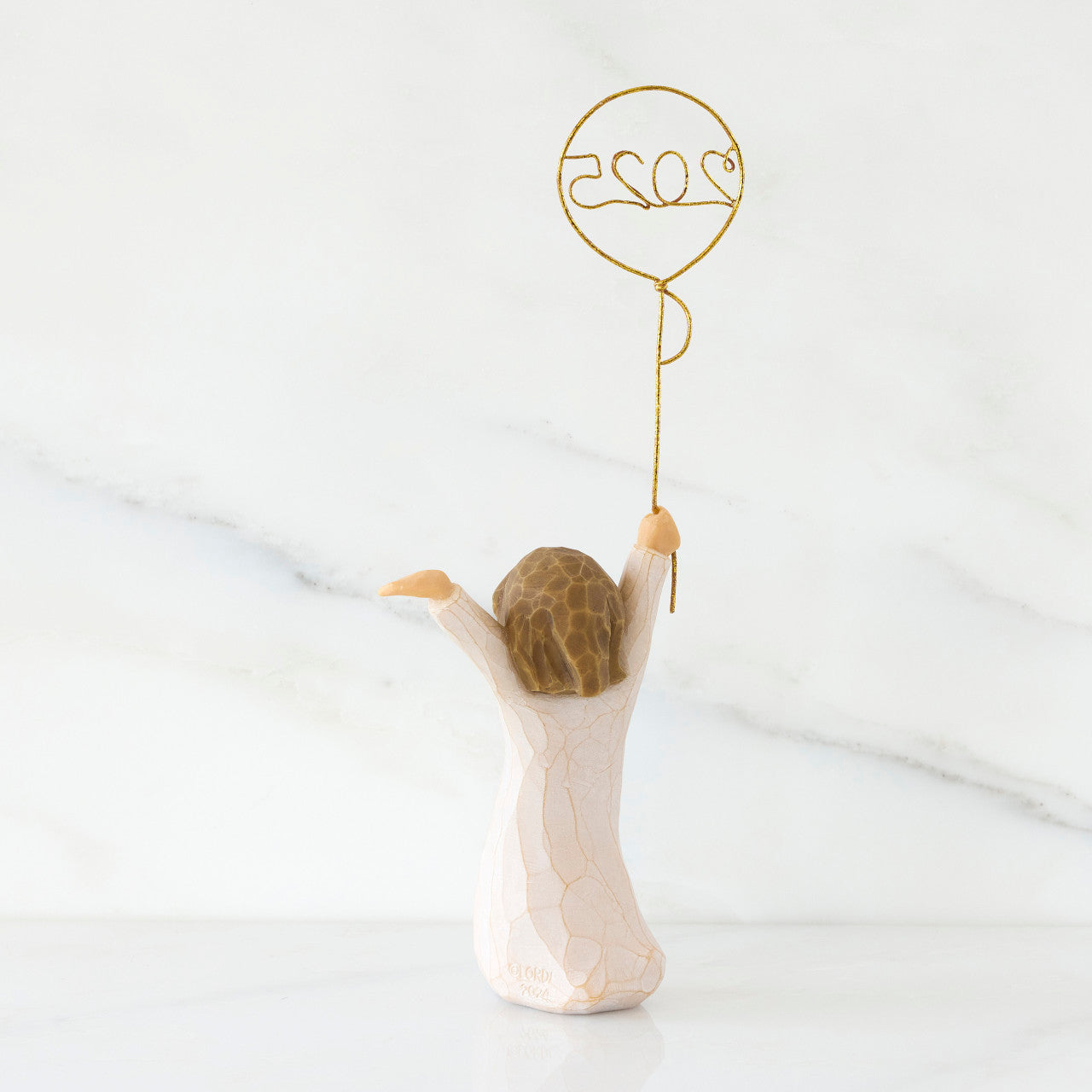 - Standing figure in cream dress, holding gold wire balloon with '2025' written in gold wire inside balloon