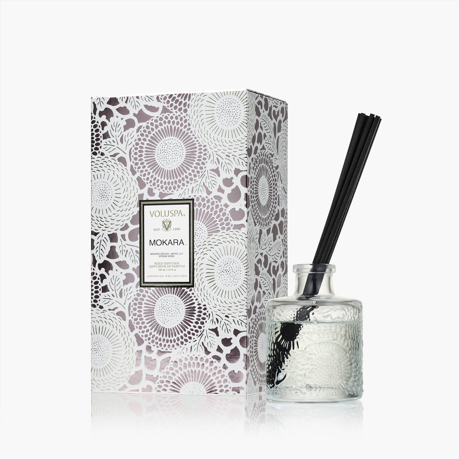 Voluspa’s fragrant diffuser oil is housed in an embossed glass vessel for a subtle pop of elegant decor. Create your homes signature, always-on fragrance in spaces requiring minimal effort, and enjoy for 2-4 months. Includes high absorbency reeds for powerful fragrance without overwhelming.