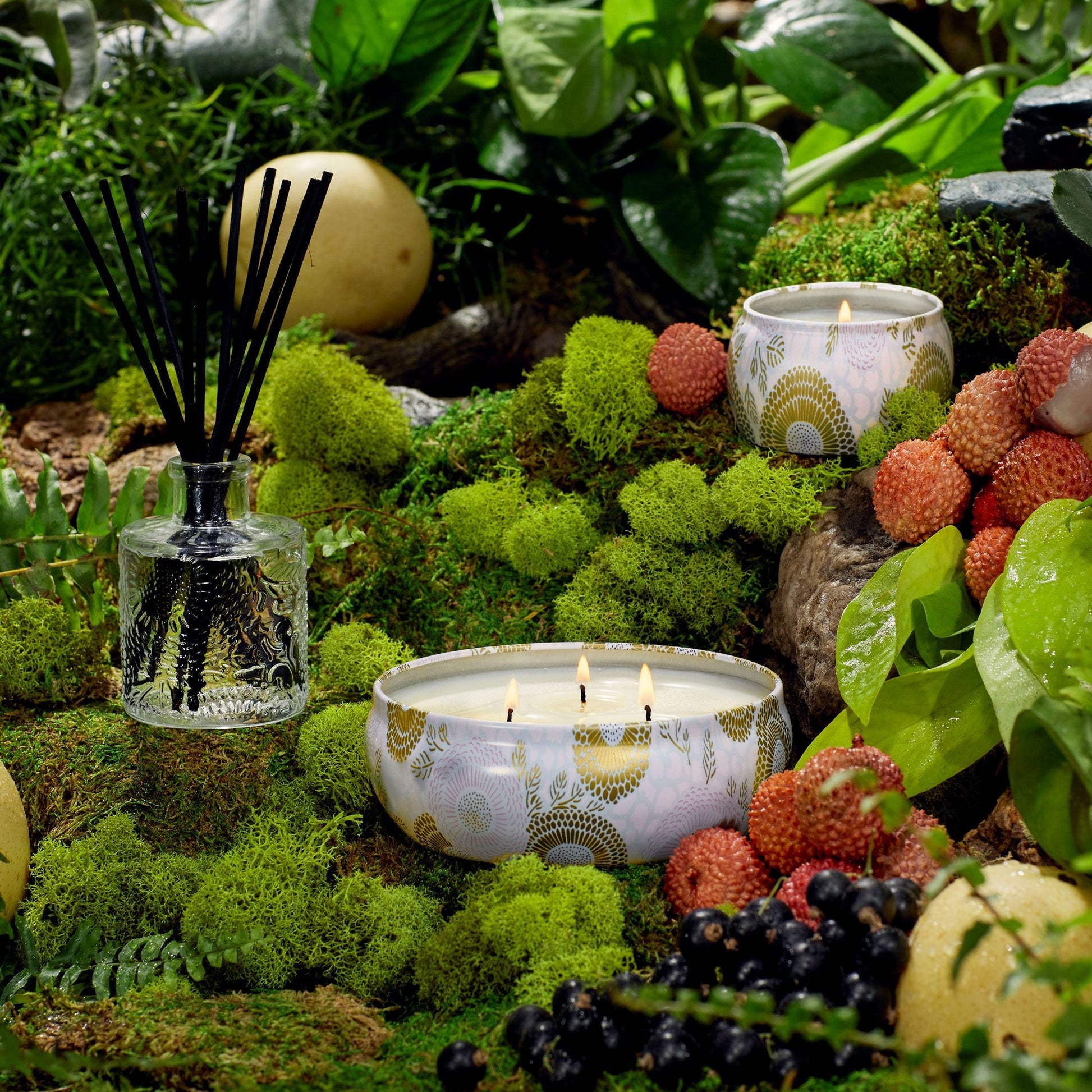 A freshly-picked cornucopia of lush lychee, crisp cassis, fresh melon and Asian pear is the inspiration for this mouth-watering, cream of the crop scent. A daily serving from this juicy gardens harvest will revitalize and enliven the ambiance of any room.