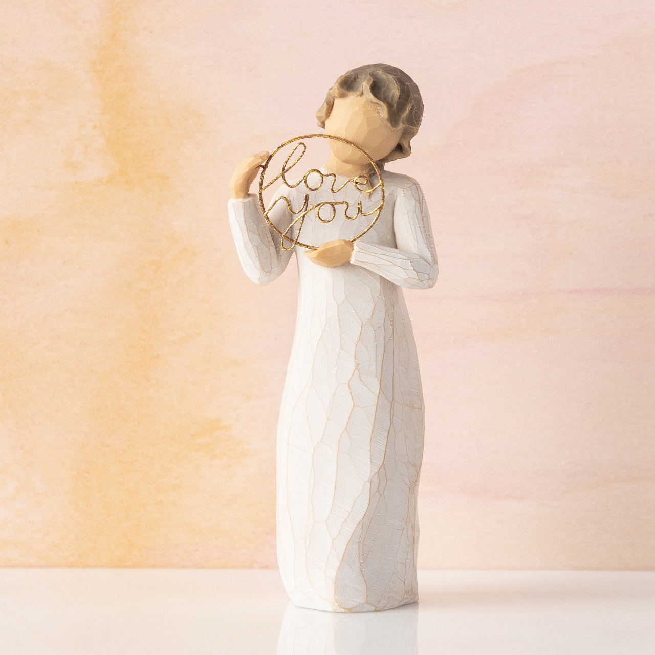 Two small words, said frequently in parting, which mean so much! This figure displays your feelings—on the record—as a visible reminder to the people in your life to whom you can’t say it enough. To your children, your spouse, your Valentine, your friends... Just a little reminder!