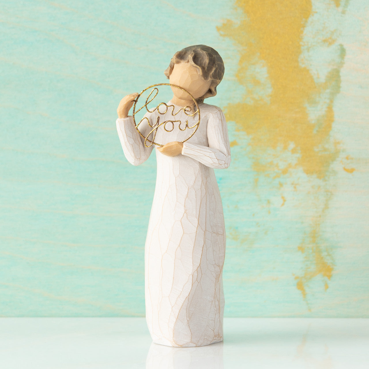 - Standing figure in cream dress, holding gold wire circle in which is written 'love you'