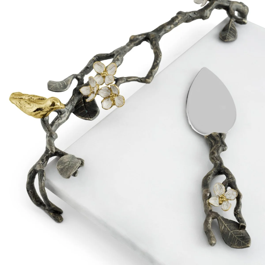 The Lovebirds Cheese Board with Knife embodies love and connection. Handcrafted with sculpted birds and delicate blossoms, it symbolizes devotion, unity, and innocence.