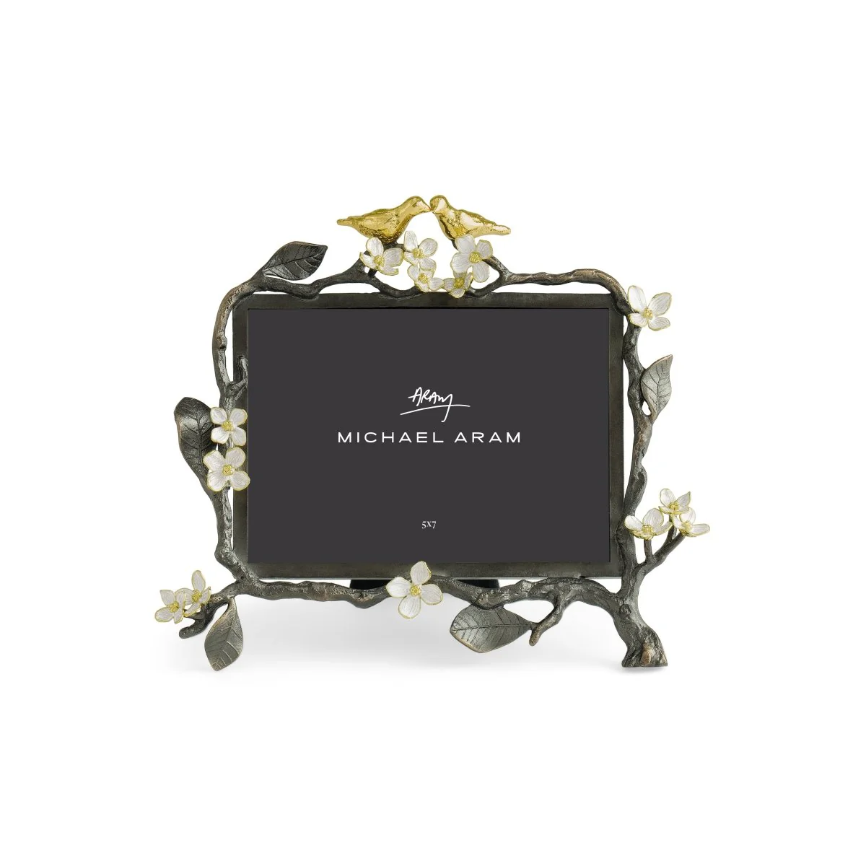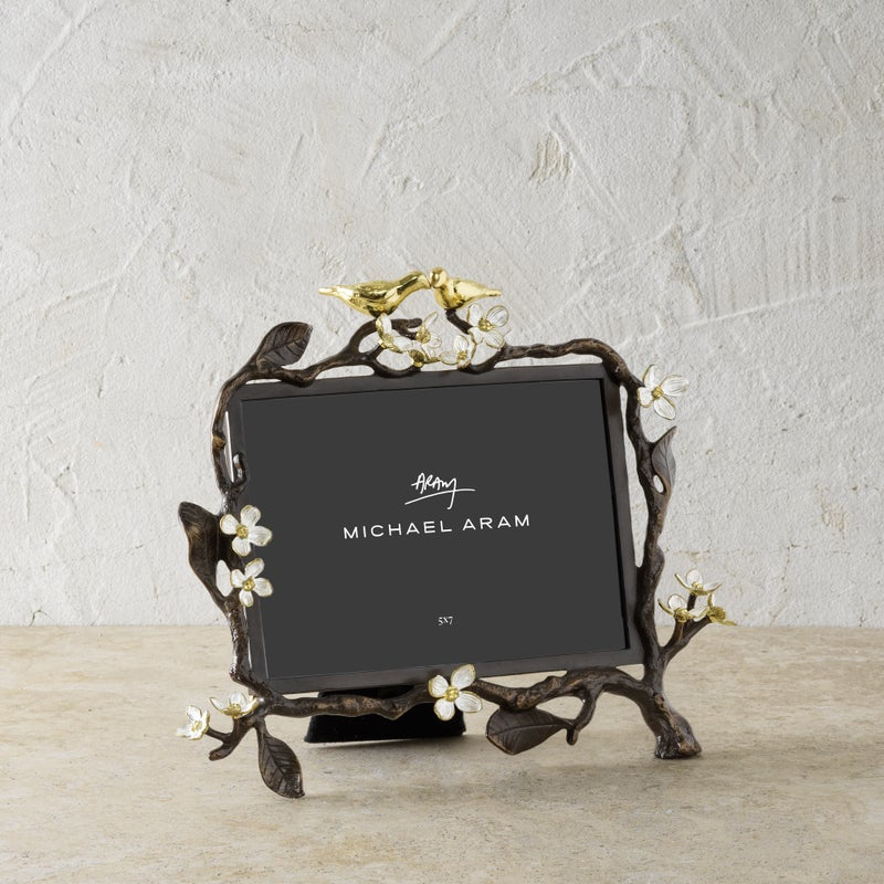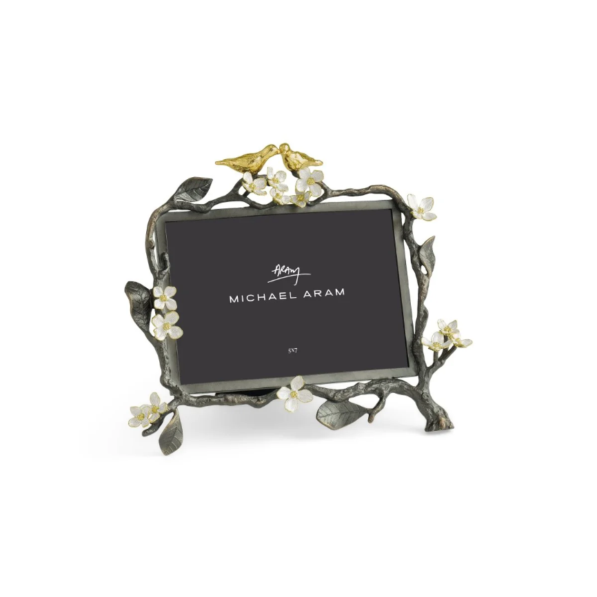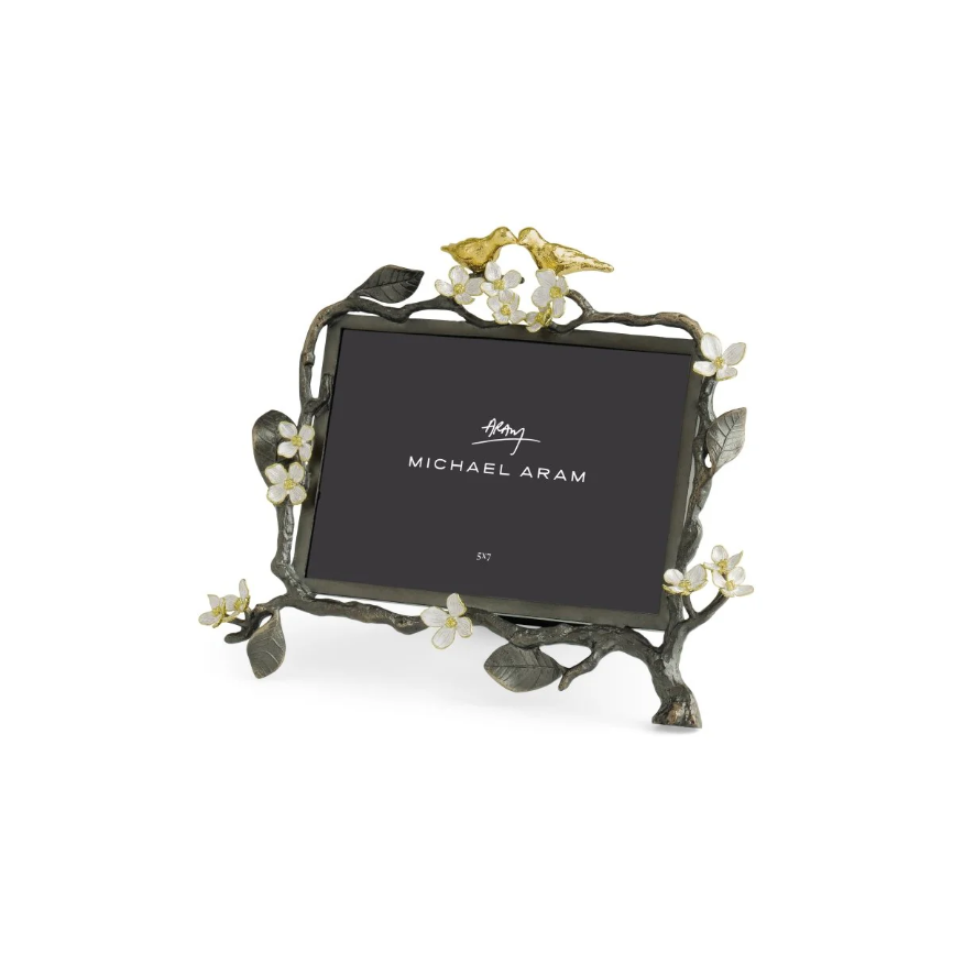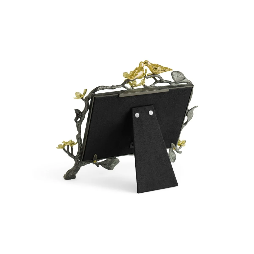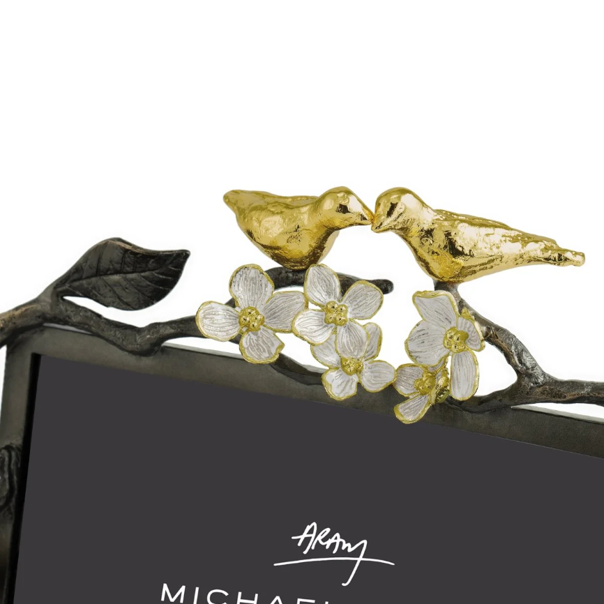 The Lovebirds Frame 5 x 7 is a handcrafted tribute to love and connection. Delicate lovebirds perch on a branch inspired by the Tree of Life, accented with white four-petaled flowers symbolizing wholeness, unity, and innocence.