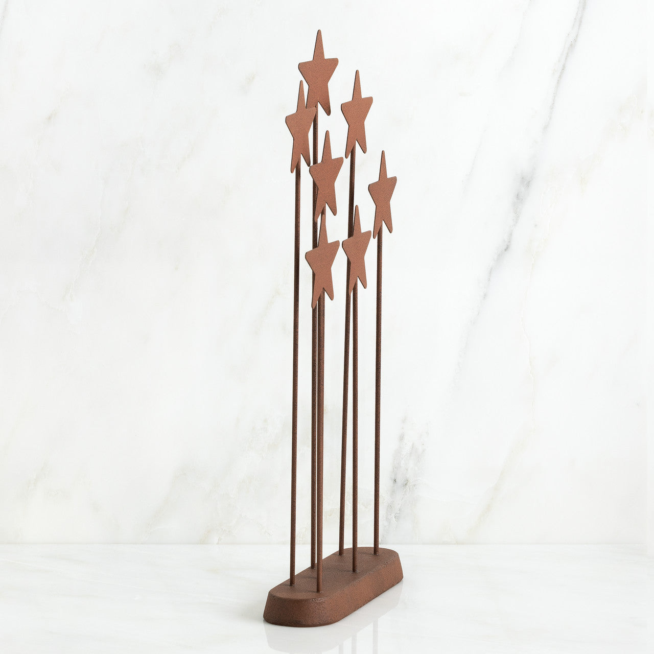 - Seven rusted brown metal stars, each atop a metal rod of varying height, and affixed to weighted base. Sized to complement the Nativity set