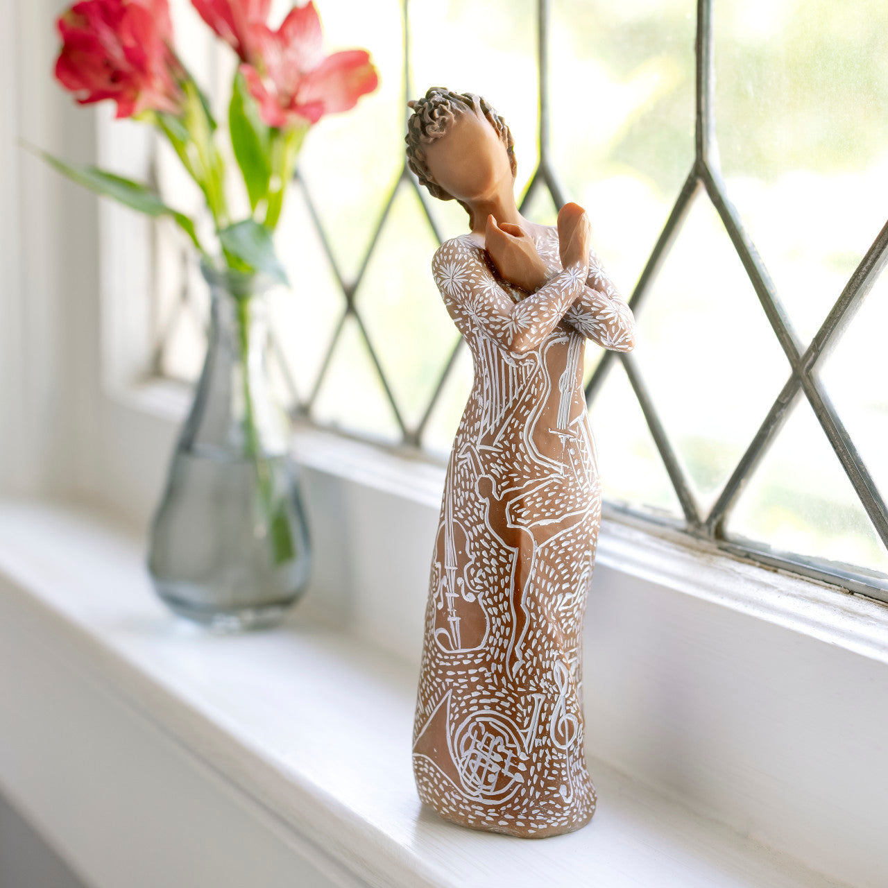 A gift for people who are musicians, actors, singers, dancers… those who share their musical talent with others through teaching or performance. Also, a gift for those who ENJOY the performing arts in any form. This piece has darker skin and hair,and is carved with contrasting pattern of musical symbols, instruments and dancing figures. See Music Speaks with lighter skin and hair