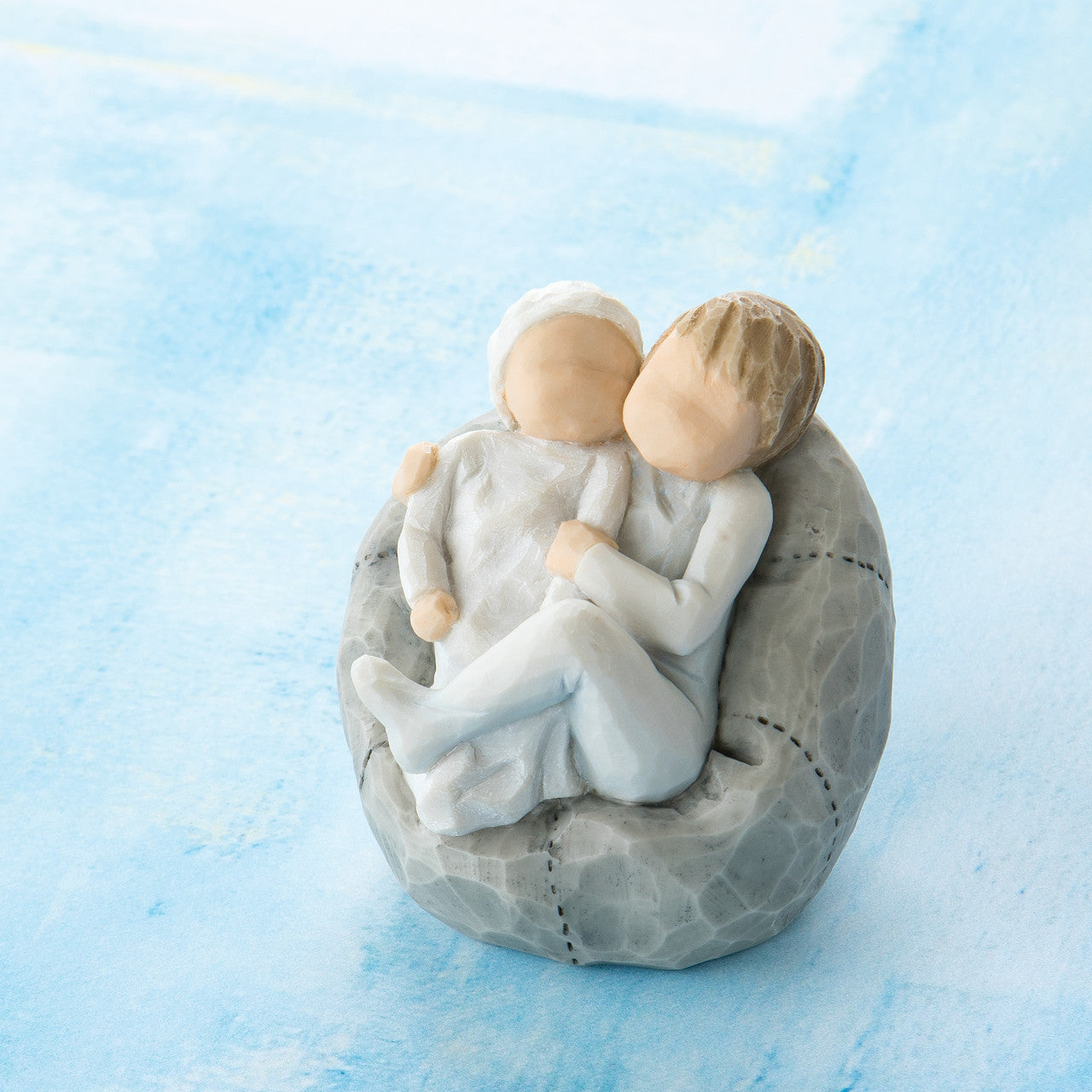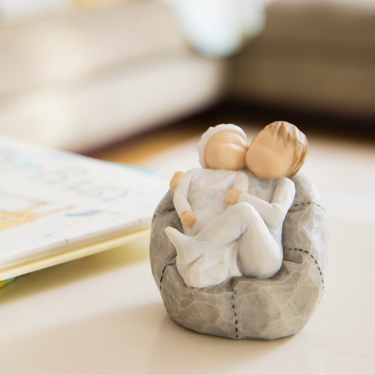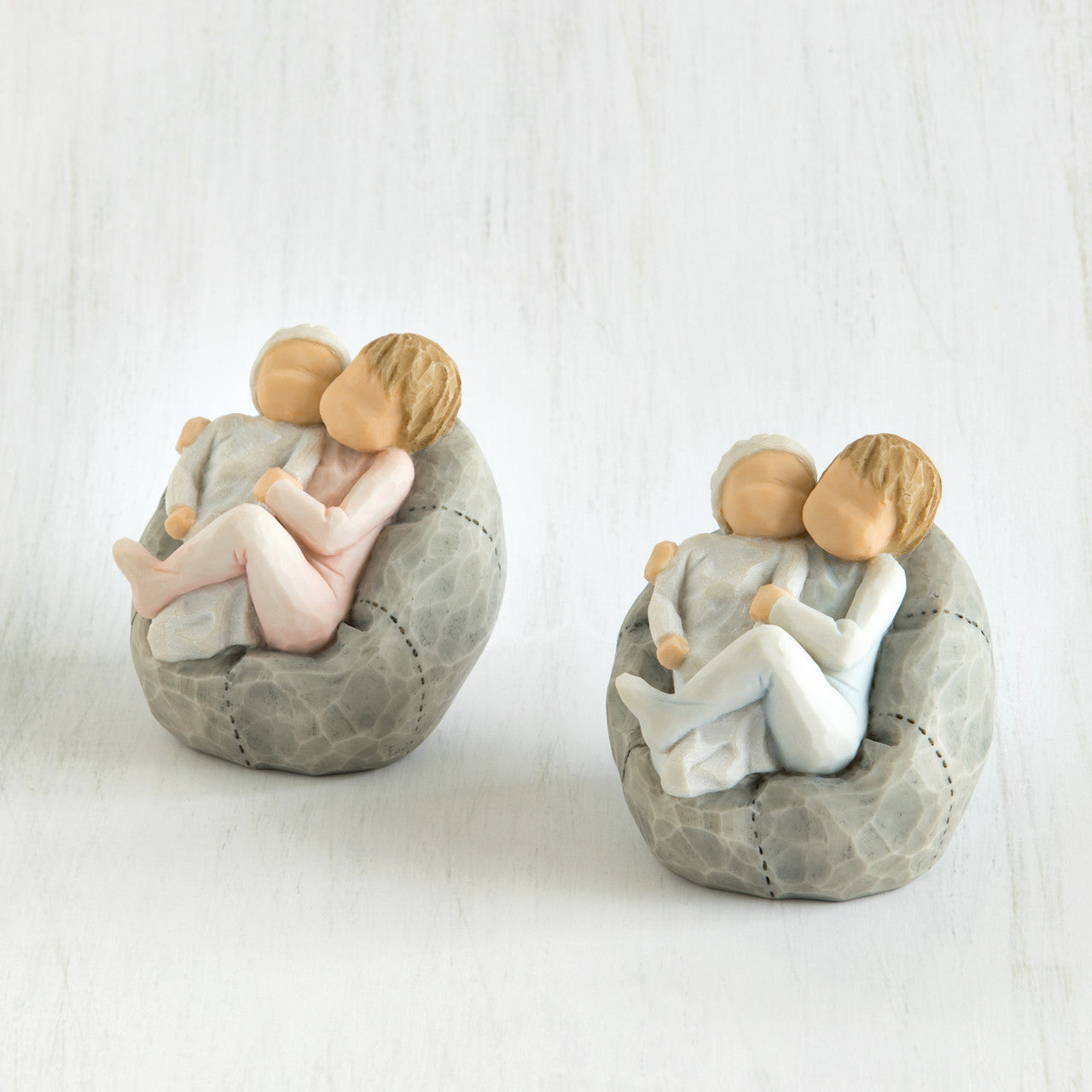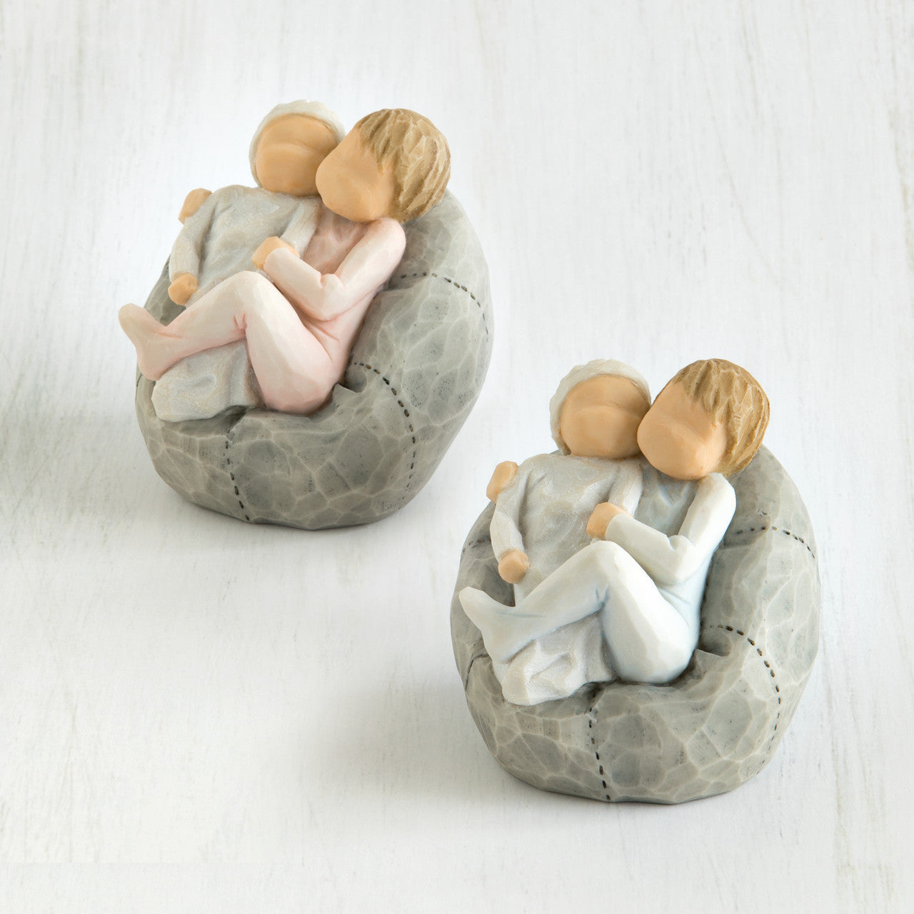 - Figure of toddler holding infant, cuddled together in a beanbag. Toddler wearing sky blue onesie; baby wrapped in cream-color blanket with cream hat