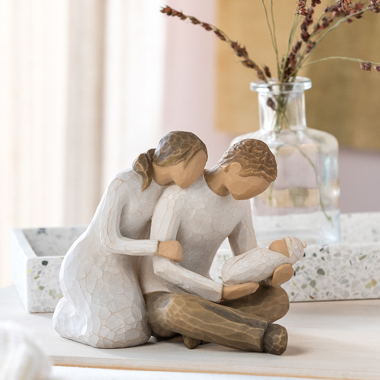 - Figure of seated couple holding newborn baby. Woman in cream dress, man in cream shirt and dark pants, baby in cream blanket