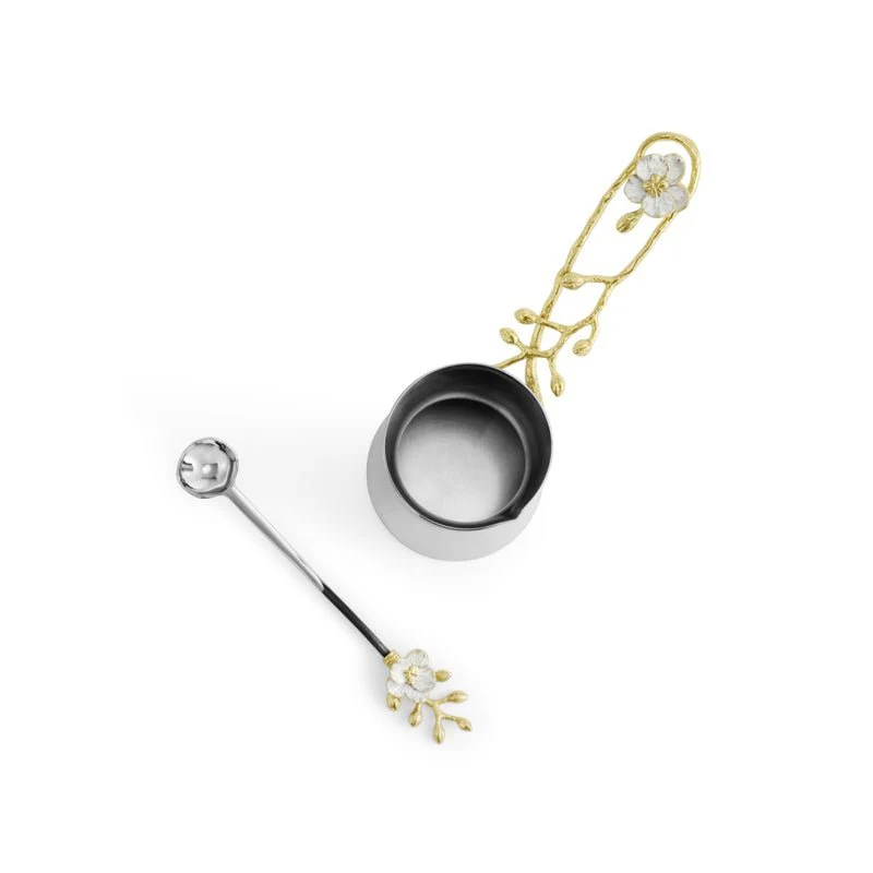 The Orchid Coffee Pot with Spoon from Michael Aram embodies the delicate beauty and sensuality of the orchid flower. Handcrafted in stainless steel and natural brass, the coffee pot is adorned with white enamel blooms that gleam with a quiet, captivating vibrance. The elegant design combines soft curves with sculptural precision, evoking a sense of refined luxury. Anchored in marble, each piece is meticulously crafted to offer lasting beauty and grace. Available in two sizes, this exquisite coffee pot, complete with an intricately designed spoon, is a true work of art for any luxury home.