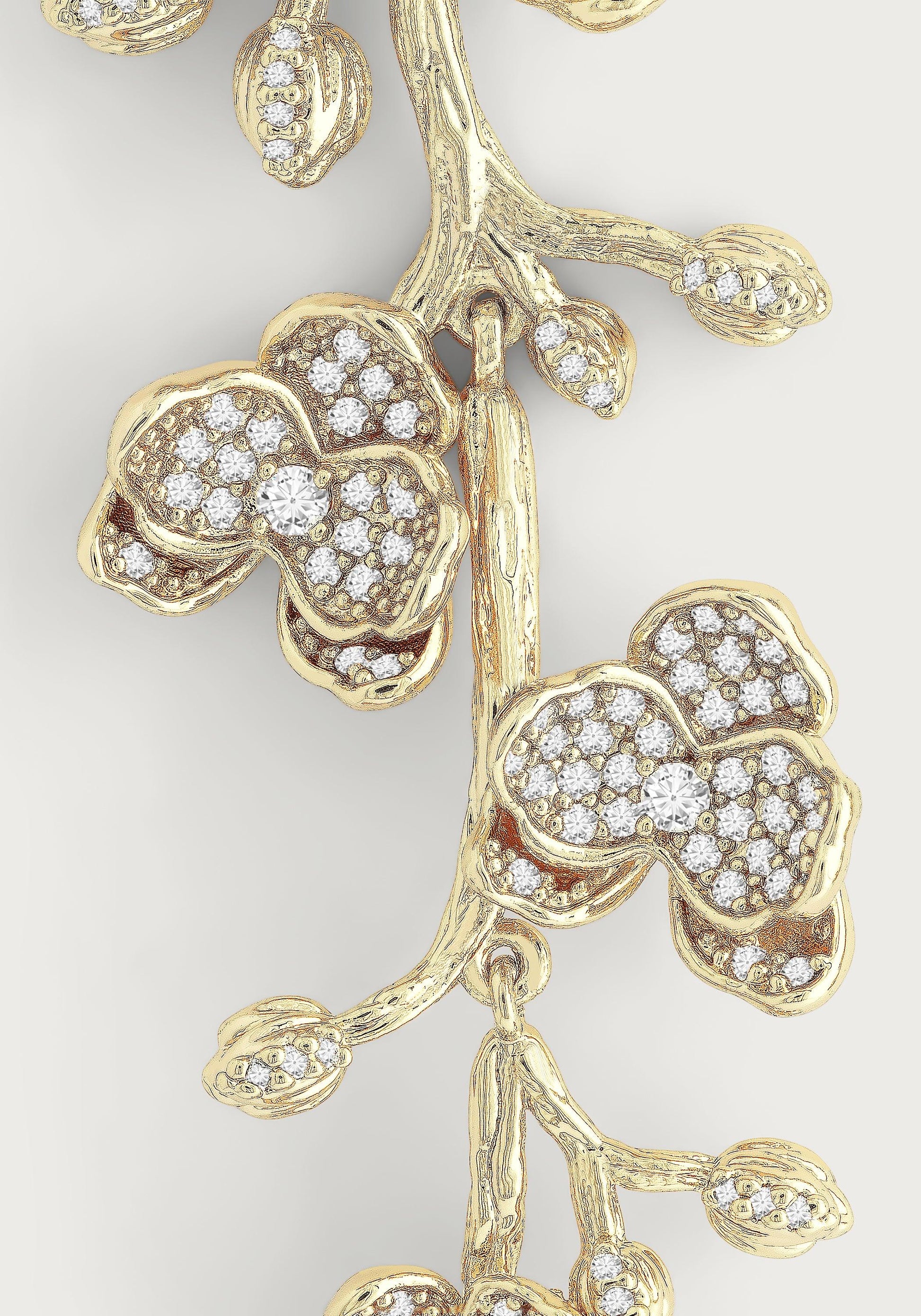 Featuring 18k gold dipped brass accented with hand set crystals, the sculpts of the earrings are as delicate as they are intricate. The stems each have multiple hinges, allowing the crystal pavé flowers in clear white crystal, to swing and catch the light beautifully.