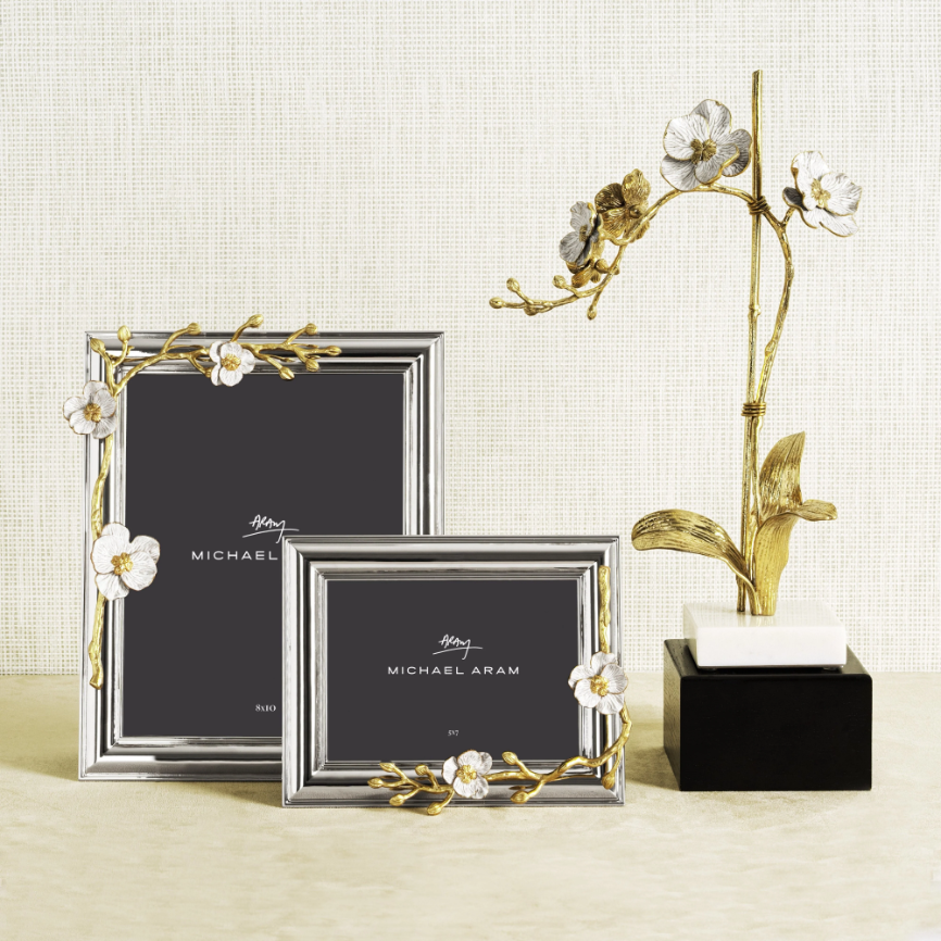 The Orchid Stem Sculpture captures the ethereal beauty of orchids, symbolizing purity and grace. Handcrafted in golden brass with white enamel, each bloom exudes delicate elegance.