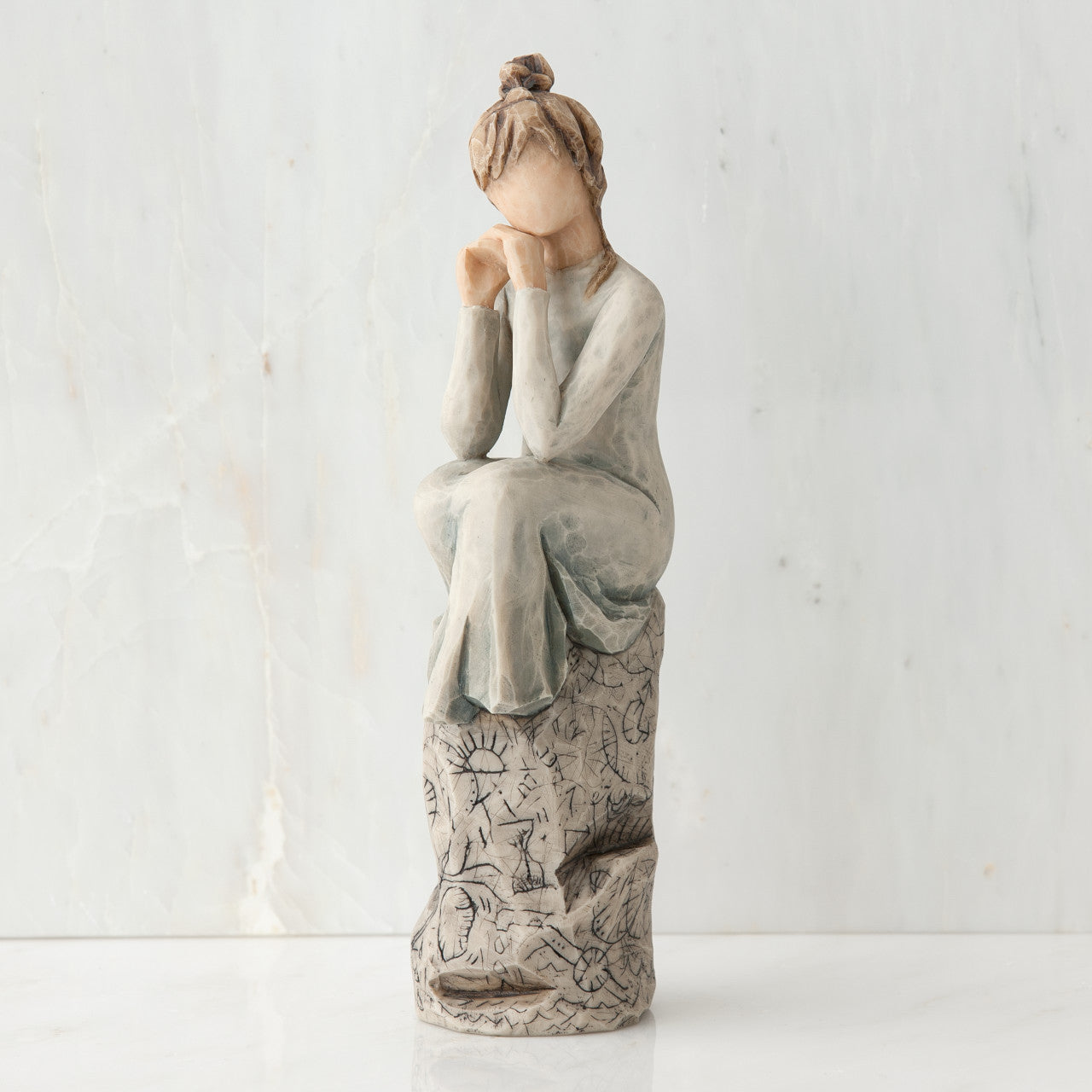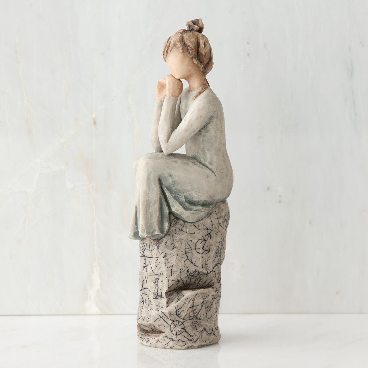 - Figure in blue/gray dress, sitting on rock, with hands up to chin. Gray rock is etched with symbols and words
