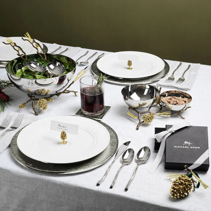 The Pine Cone Serving Bowl by Michael Aram captures the spirit of the season with sculptural elegance. Handcrafted in antique gold and darkened bronze, this striking bowl reflects the intricate beauty of a pinecone—an enduring symbol of renewal, wisdom, and festive warmth.