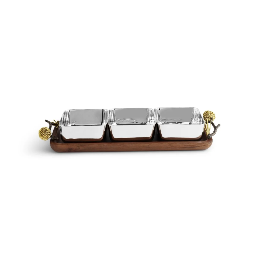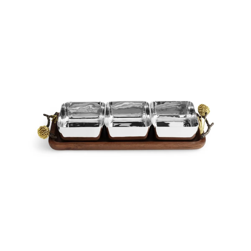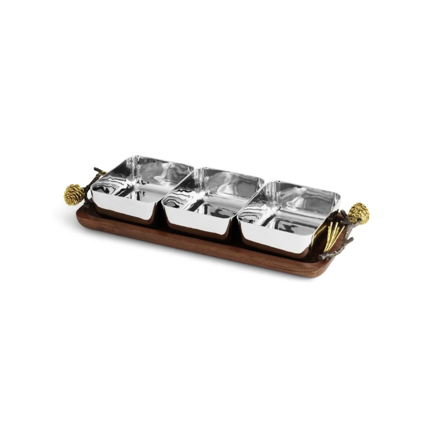 A striking blend of artistry and function, the Pine Cone Wood Triple Bowl is handcrafted in rich wood and adorned with sculpted brass pinecones in antique gold and oxidized finishes. Evoking the festive spirit of the season, this elegant piece symbolizes renewal and brings a sense of warmth and refinement to holiday entertaining.