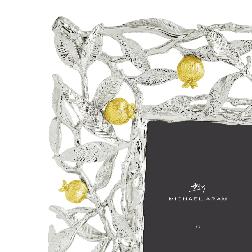Celebrate cherished memories with the Michael Aram Pomegranate 5x7 Frame, a luxurious, handcrafted piece inspired by one of the world’s oldest symbols. Made from nickelplate and goldtone, its sculptural pomegranate accents evoke warmth, tradition, and the beauty of life’s meaningful moments—turning every photo into a timeless keepsake.