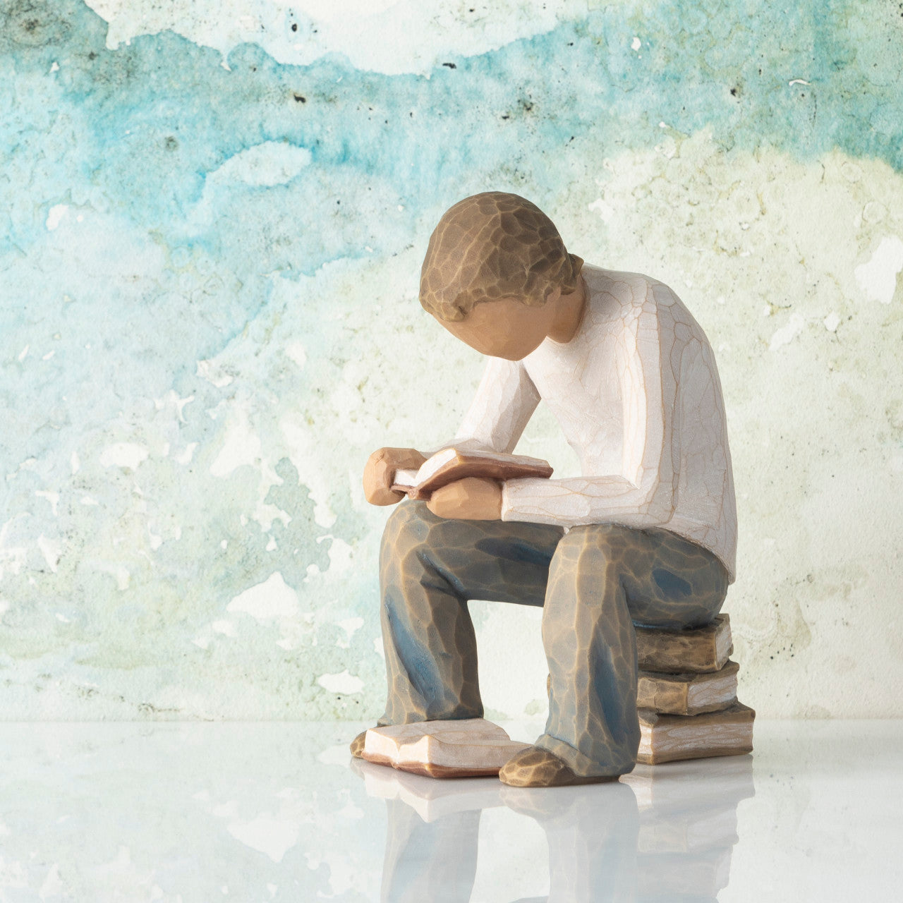 - Figure of young man in cream shirt and blue jeans, seated on stack of books, reading book