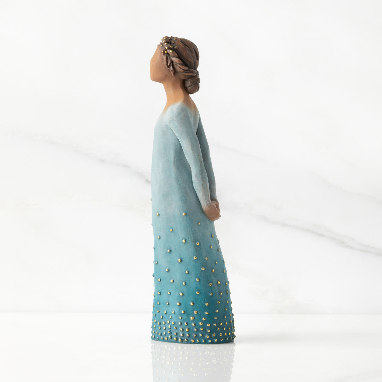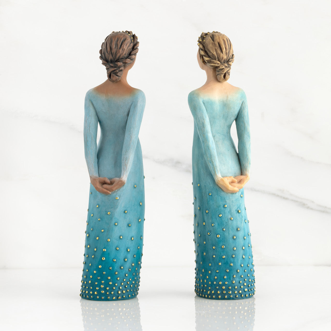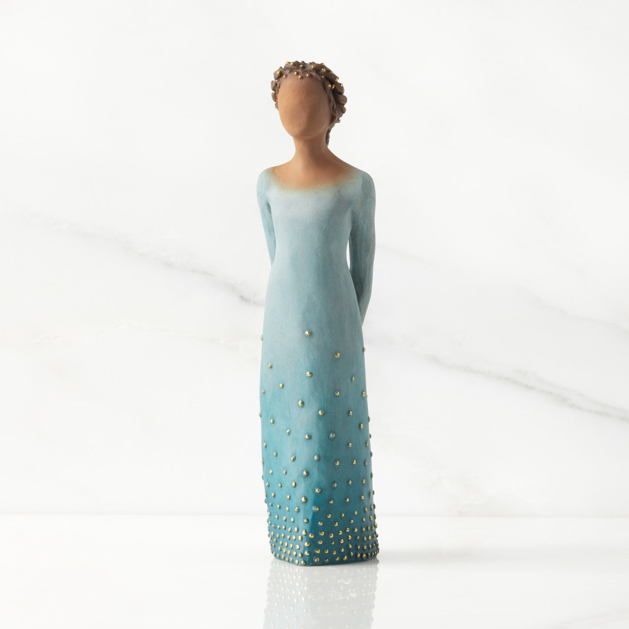 A gift of support and encouragement as a reminder that beauty radiates from within. For one gaining strength and confidence, overcoming adversity or becoming independent. For those who practice self-compassion and prioritize wellness. Radiance is available in two skin tones. This piece has darker skin and hair; her hair and deep blue ombré dress are dotted with gold leaf.
