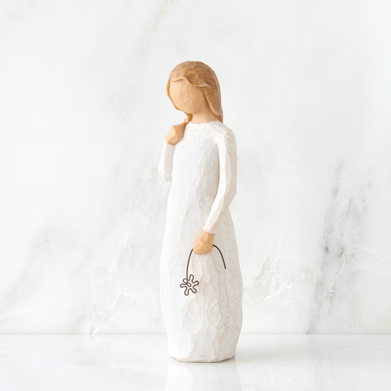 - Standing figure in cream dress holding drooping wire flower in her hand