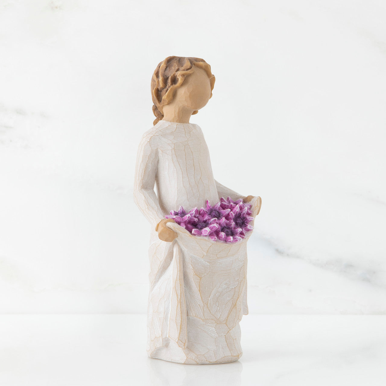 - Standing figure in cream dress, holding up skirt filled with purple daisies