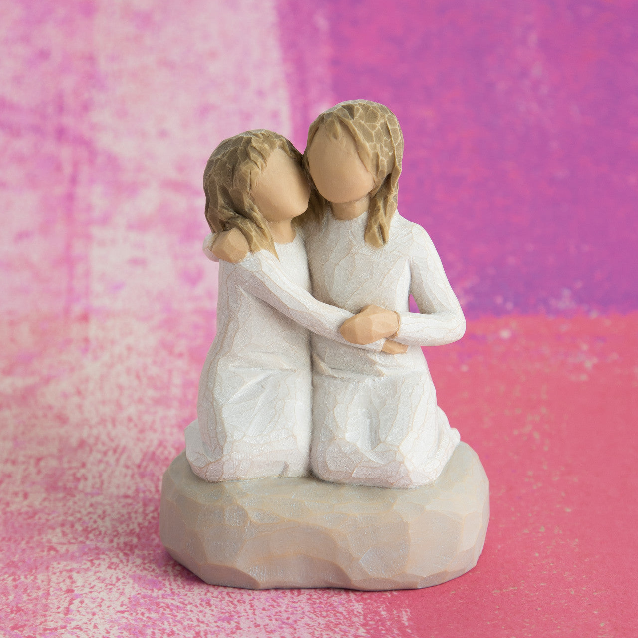 - Figure of two girls in cream dresses, kneeling next to each other on a pad. One older, one younger, with arms around each other