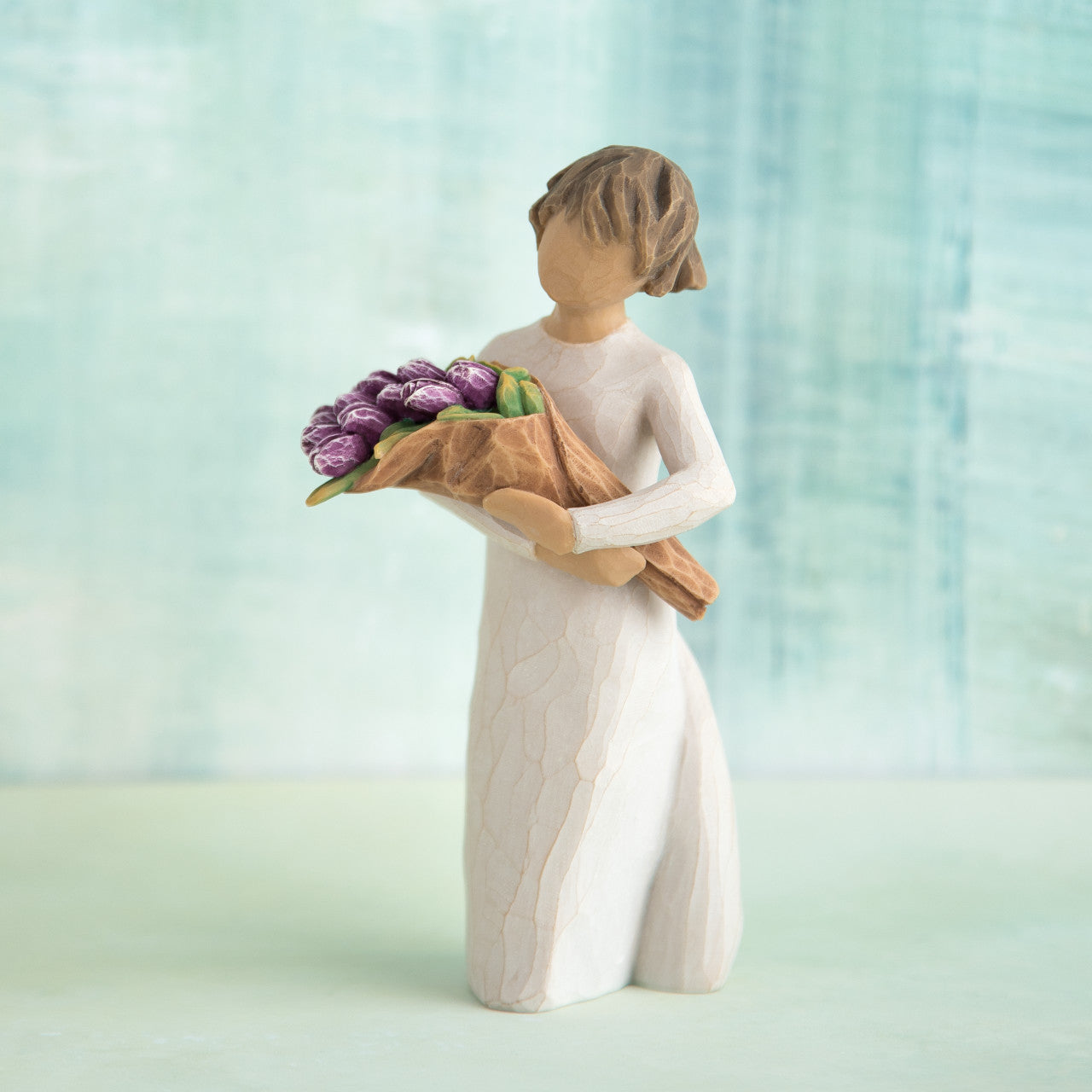 - Standing figure in cream dress, holding large bouquet of purple tulips